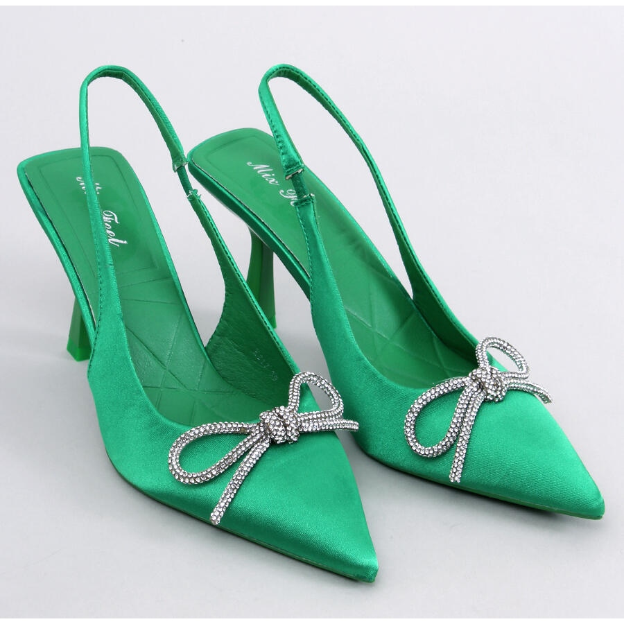 Pompe fenomenale pentru femei cu un călcâi deschis, care va sublinia caracterul unic al fiecărei creații. Finisajul din satin în nuanța verde și subțire, călcâiul înalt de 9 cm va sublinia frumos figura, în timp ce arcul decorativ cu pietre strălucitoare (zircons) adaugă stil și splendoare subtilă. Perfect pentru bal, nuntă, minge sau alte ocazii unice.