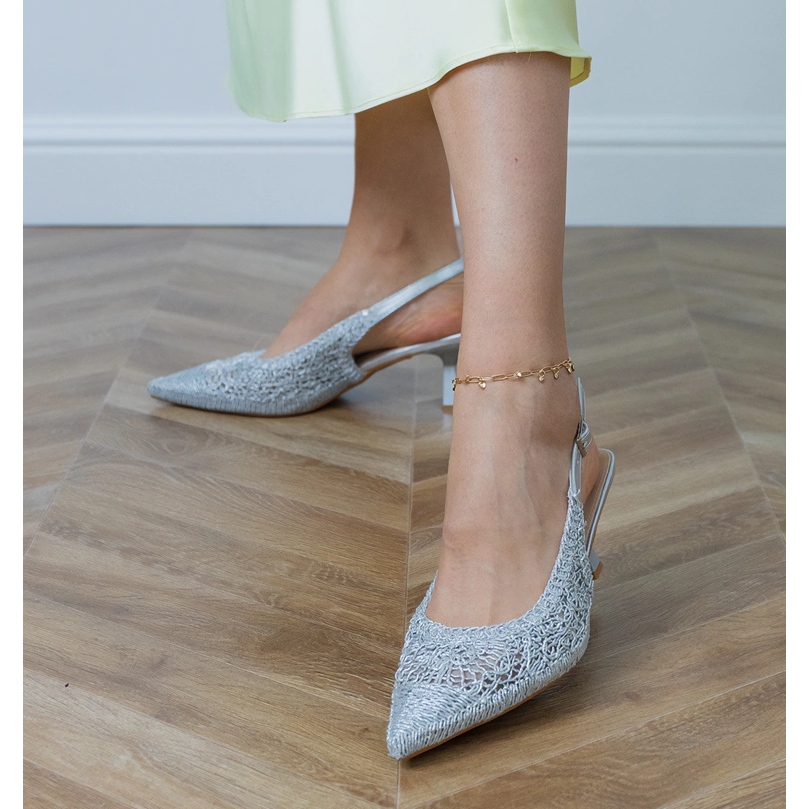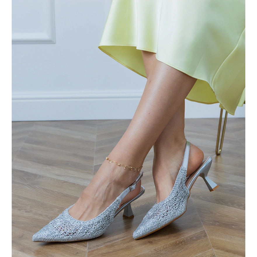 NU SĂ SĂ SĂ PĂSTRAȚI! Adăugați pompe de argint împletite cu un călcâi deschis în colecția dvs. și creați stilizări de neuitat care vor încânta toată lumea.