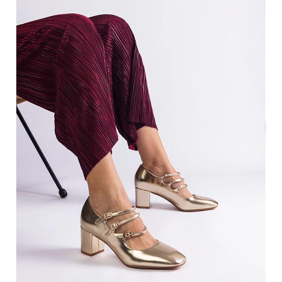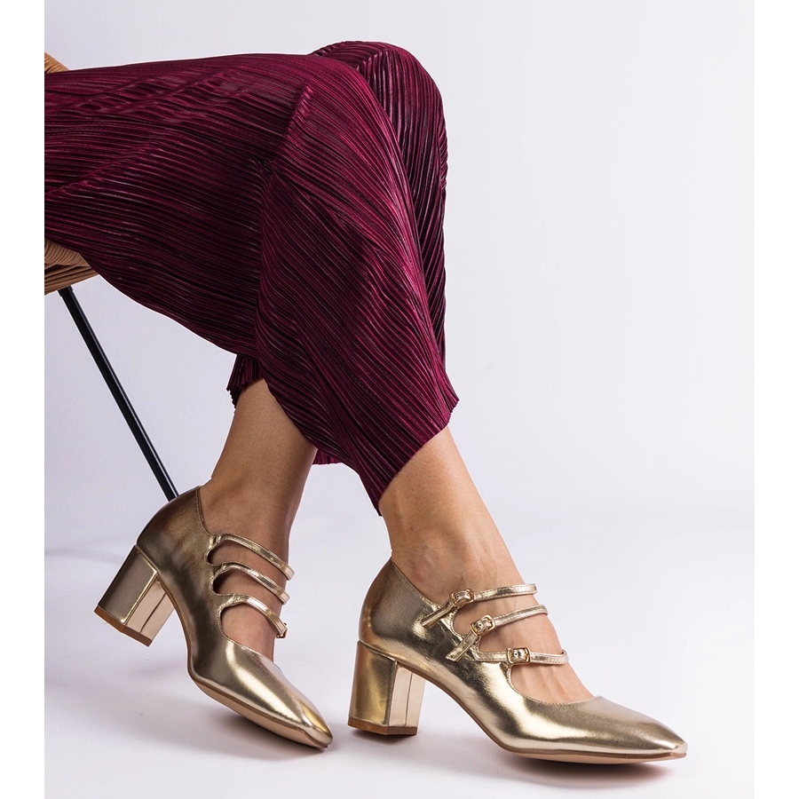 Pompele de aur pe un post cu catarame decorative sunt o propunere ideală pentru femeile care doresc să combine moda cu confortul. Acești pantofi eleganți se disting nu numai printr -o culoare aurie frumoasă, ci și cu un design modern, datorită unui NOSC STATE și a finisajului metalic. Pielea organică de înaltă calitate face ca pompele să nu fie doar durabile, dar și plăcute de purtat.