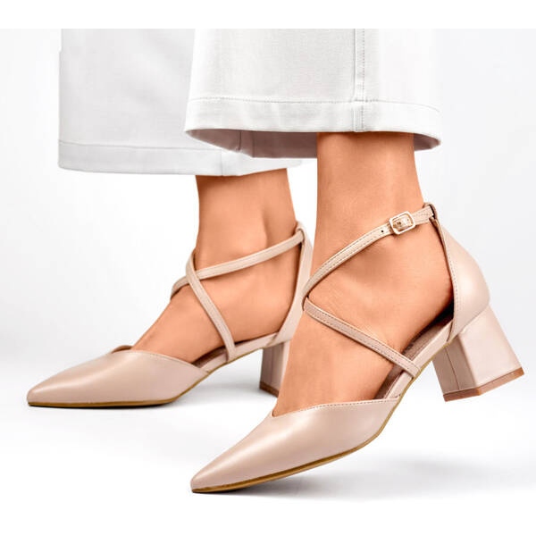 Pompele sunt echipate cu un bloc înalt de 5,5 cm, ceea ce asigură stabilitatea și confortul pe parcursul zilei de purtare. Nasul ascuțit le oferă stil și eleganță, completând perfect fiecare stilizare. Acest model are un element de fixare sub forma unei catarame, care nu numai că garantează potrivirea potrivită, dar înfrumusețează întregul cu designul său.