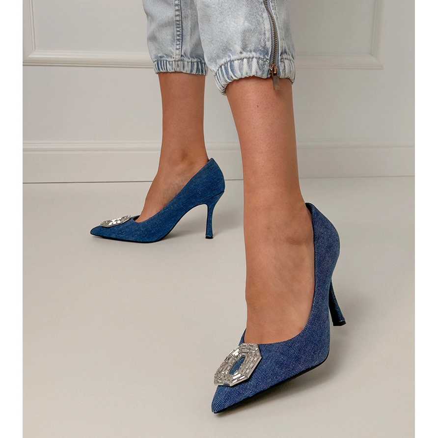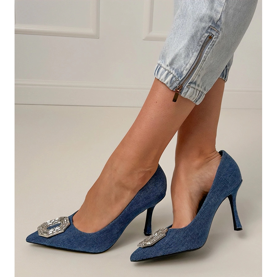 Detalii: Pompe din denim pe un știft cu zirconi albastru