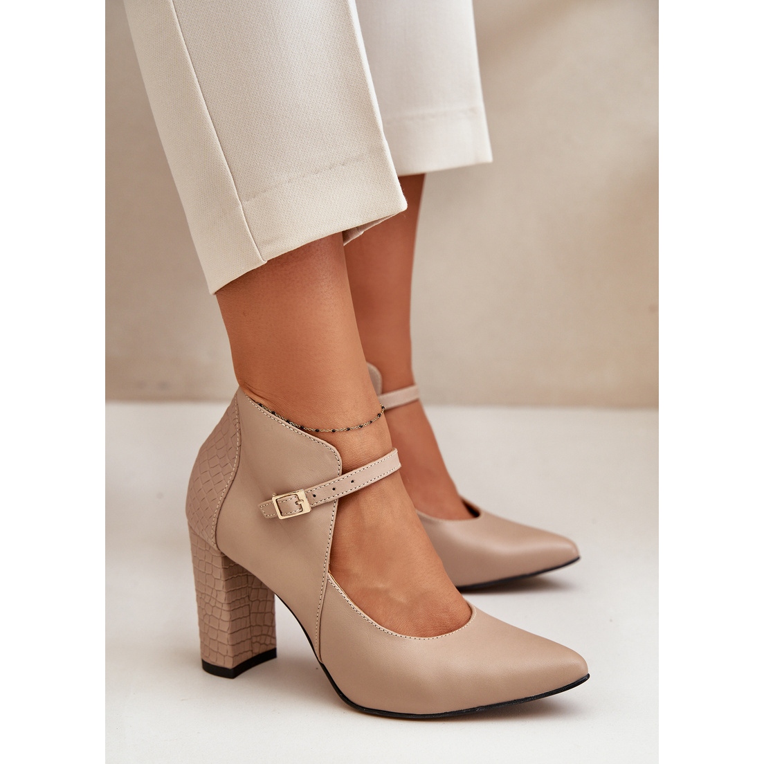 Calcul sub forma unui post înalt de 9 cm adaugă clasa fiecărei stilizări, iar culoarea lor bej le face ușor de combinat cu diverse haine. Căptușeala naturală din piele și o talpă durabilă din plastic garantează durabilitatea și confortul pe parcursul zilei.