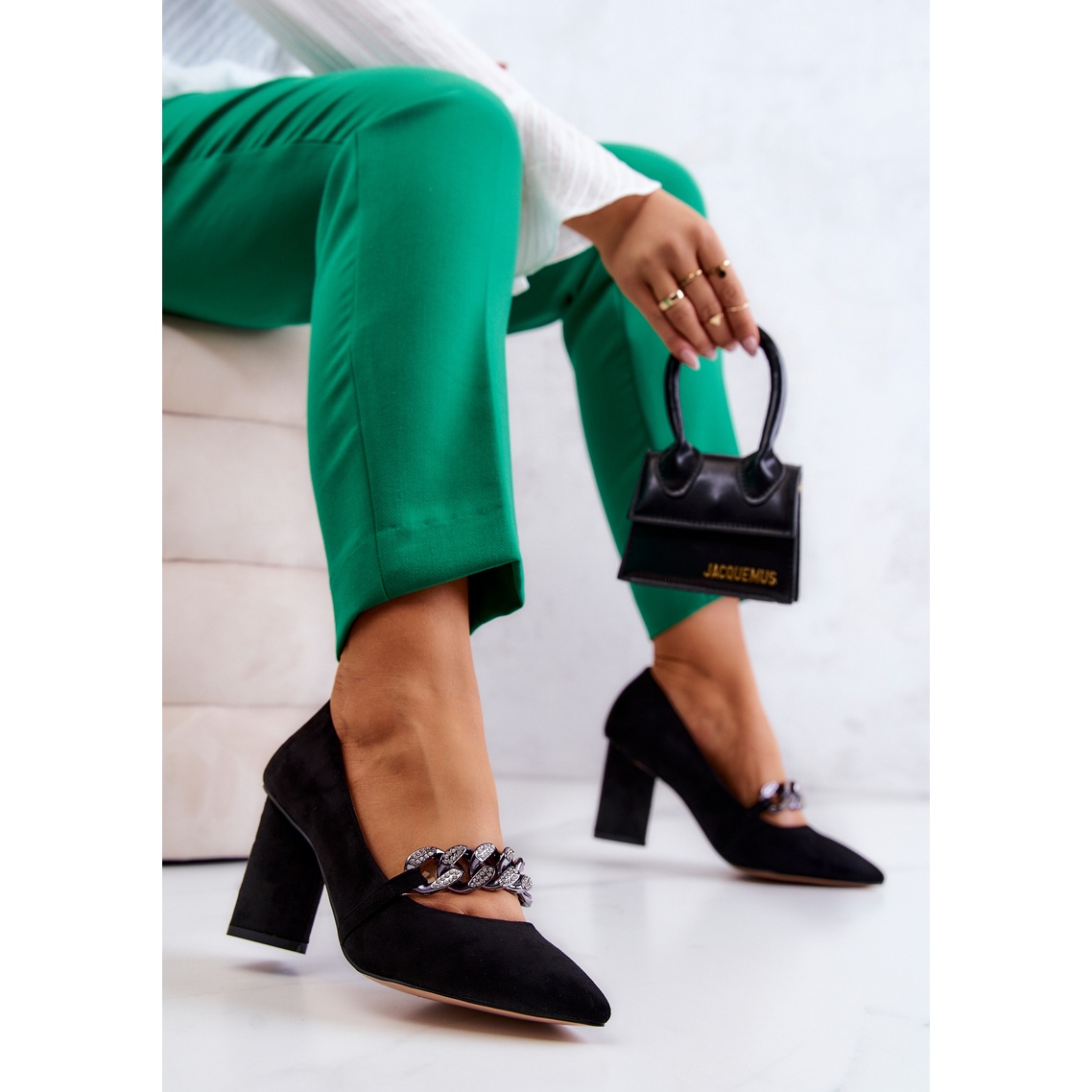 Cu un vârf ascuțit unic și un lanț decorativ spectaculos care strălucește datorită strasurilor strălucitoare care imită strasurile, aceste pompe cu siguranță vor atrage atenția. În plus, o curea transparentă plasată sub lanț asigură siguranță maximă și confort la purtare, protejând piciorul împotriva abraziunilor.