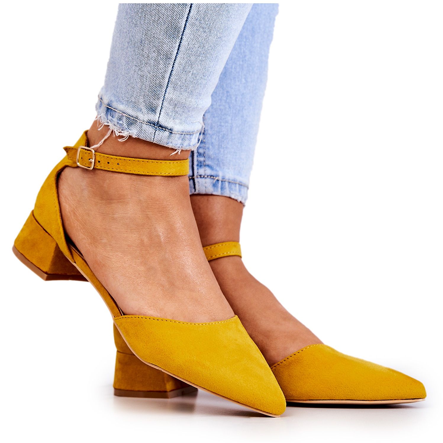 Fața de 7,5 cm înălțime subliniază picioarele, iar tocul plat de 3 cm face ca pantofii să fie perfecti pentru purtarea de zi cu zi. Culoarea bej a tălpii se potrivește perfect cu galbenul suculent, ceea ce le face un plus universal pentru orice garderobă.