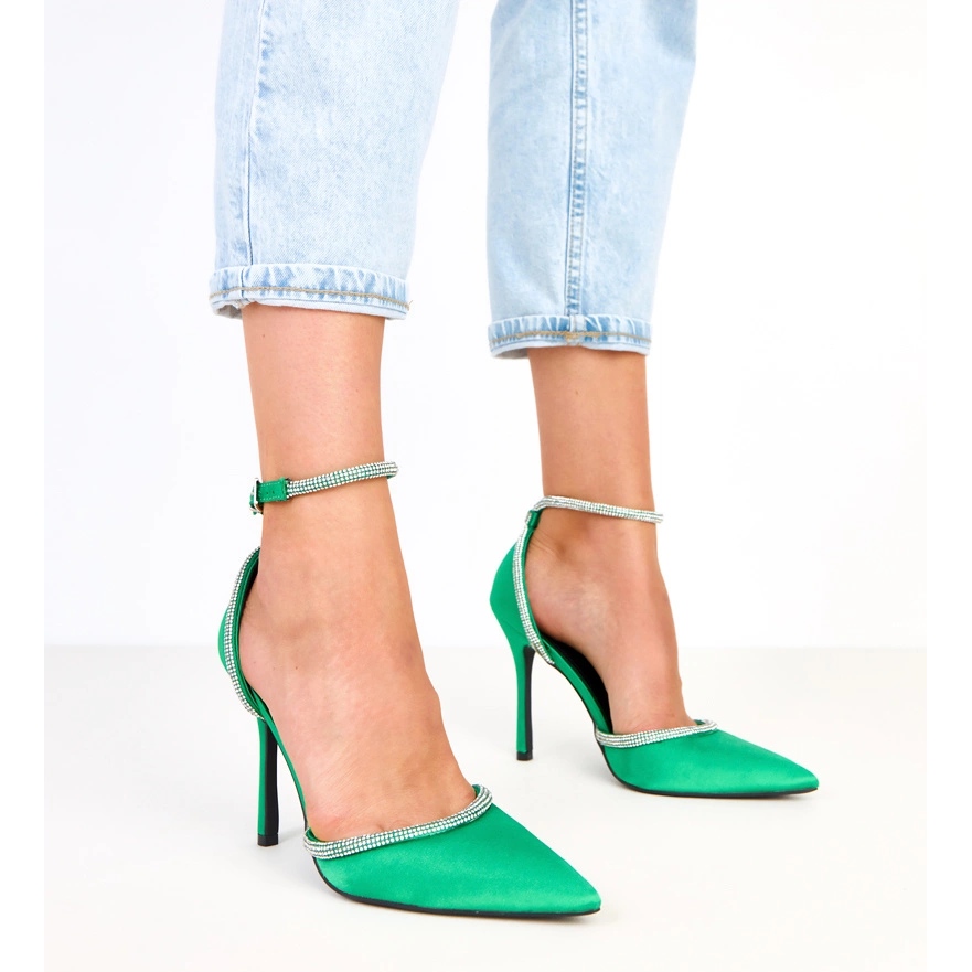Detalii: Pompe din satin verde cu zirconi fixați cu gleznă Zizia