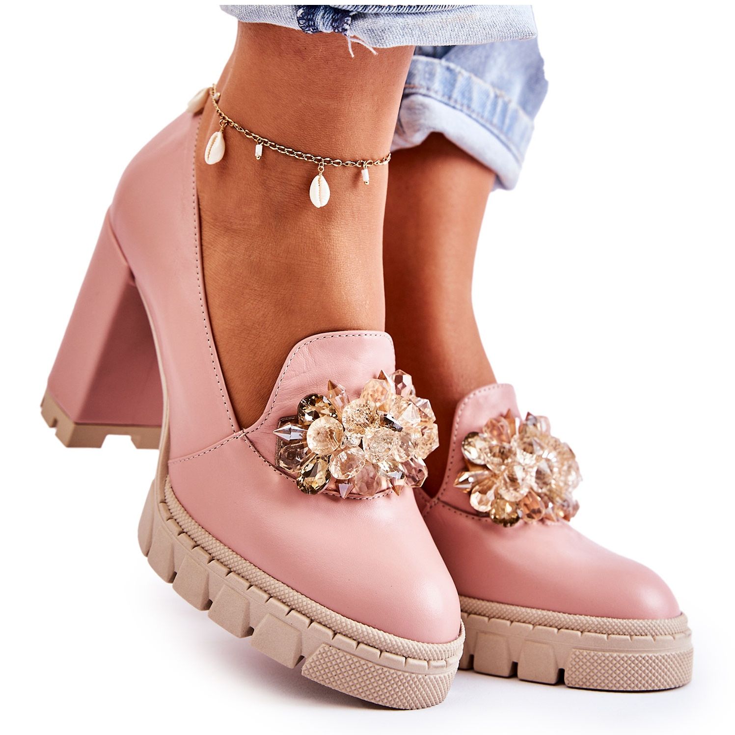 Un branț moale din piele naturală asigură confortul picioarelor tale, iar talpa sintetică cu model trapper asigură aderență și siguranță adecvate în timpul mersului. Înălțimea tocului de 7 cm, combinată cu o platformă de 2,5 cm, face ca pantofii nu numai stilați, ci și confortabili de purtat.