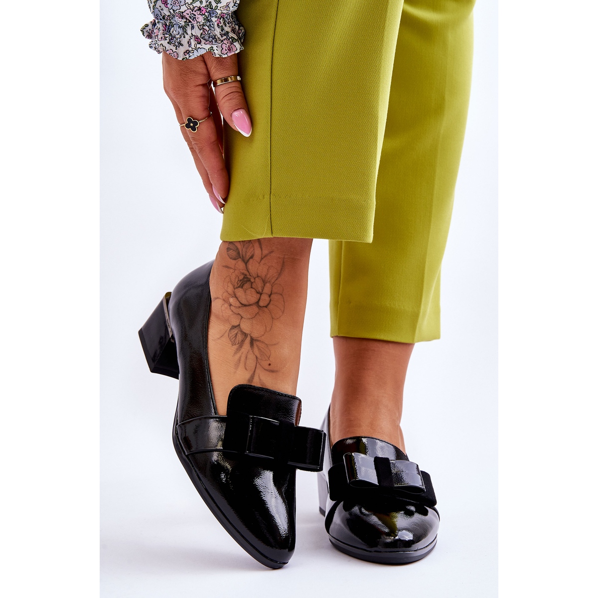 Iată pantofii care vor încânta orice iubitor de eleganță și confort - Pompe Vinceza, la modă, din piele lacuită, cu fundă decorativă, în negru. Acesti pantofi eleganti au fost conceputi pentru femeile care doresc sa combine un aspect la moda cu confortul la purtare.