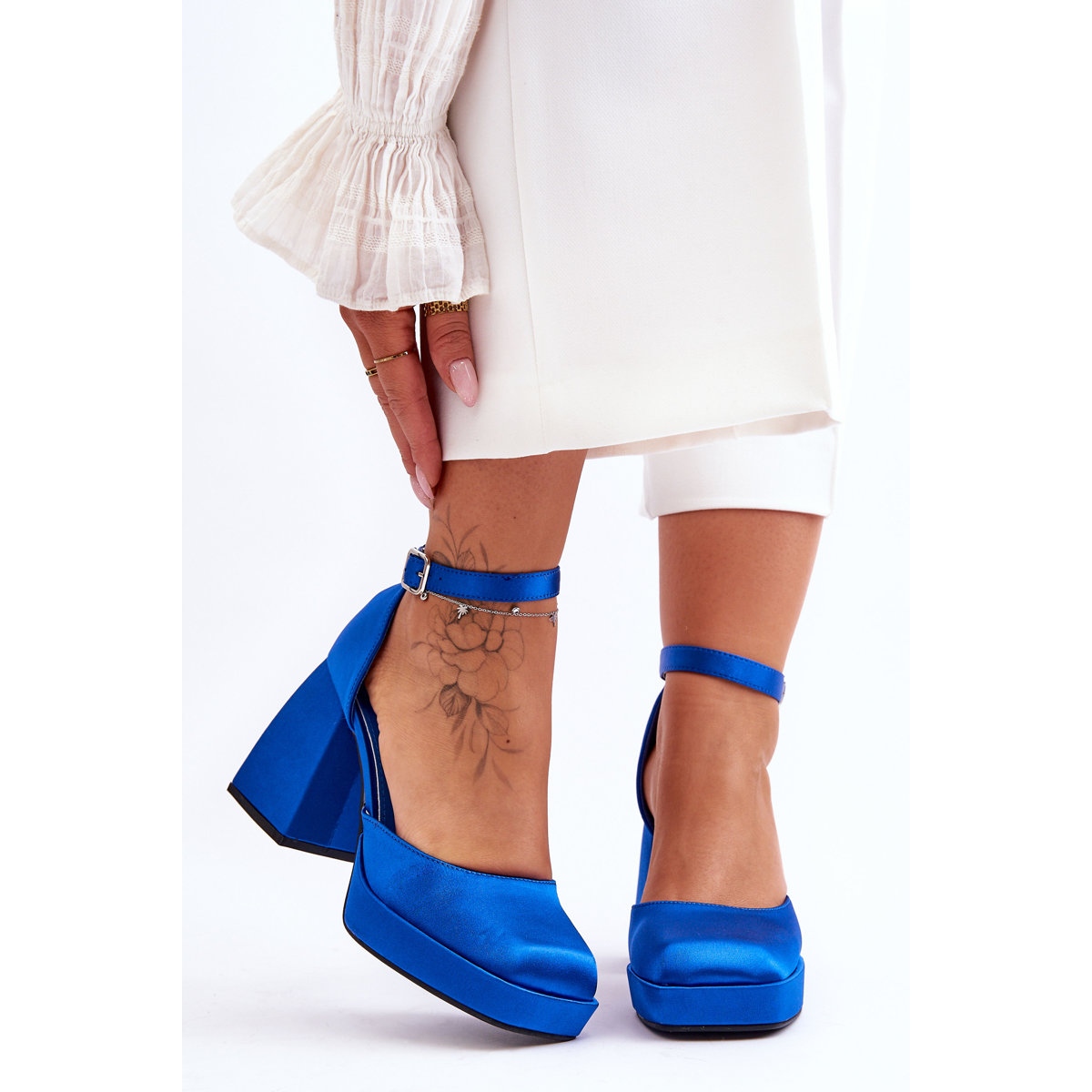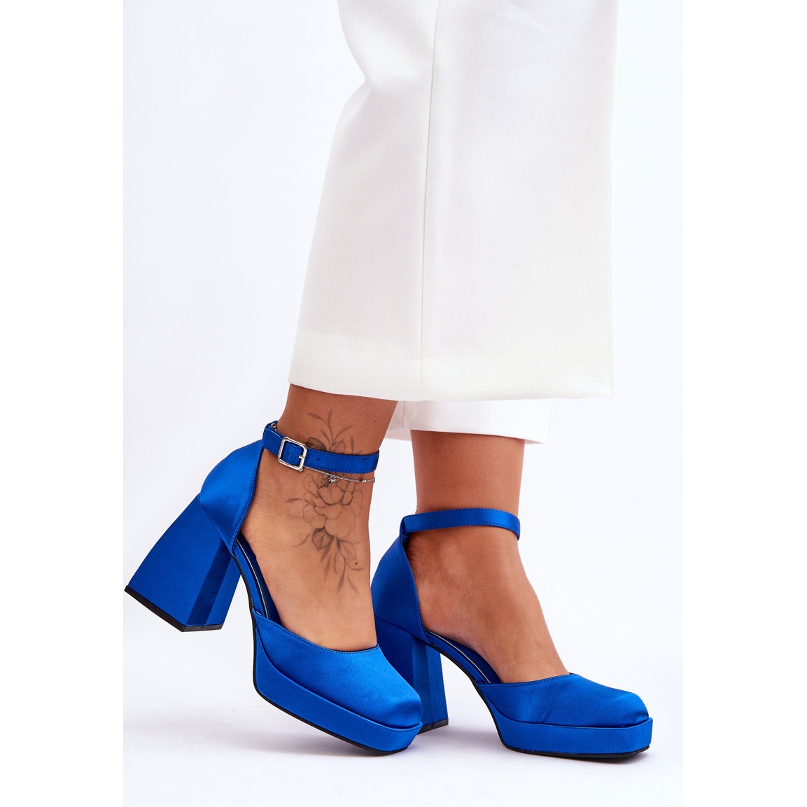 Stabilitatea pasului este asigurată de un toc masiv de 9,5 cm înalt sub formă de bloc, care, combinat cu o platformă de 2,5 cm, garantează confort indiferent de teren. În plus, vârful pătrat este un accent distinct care separă aceste pompe de modelele convenționale.
