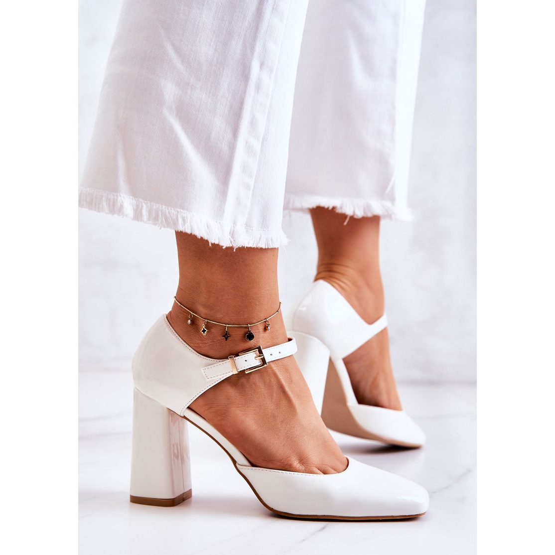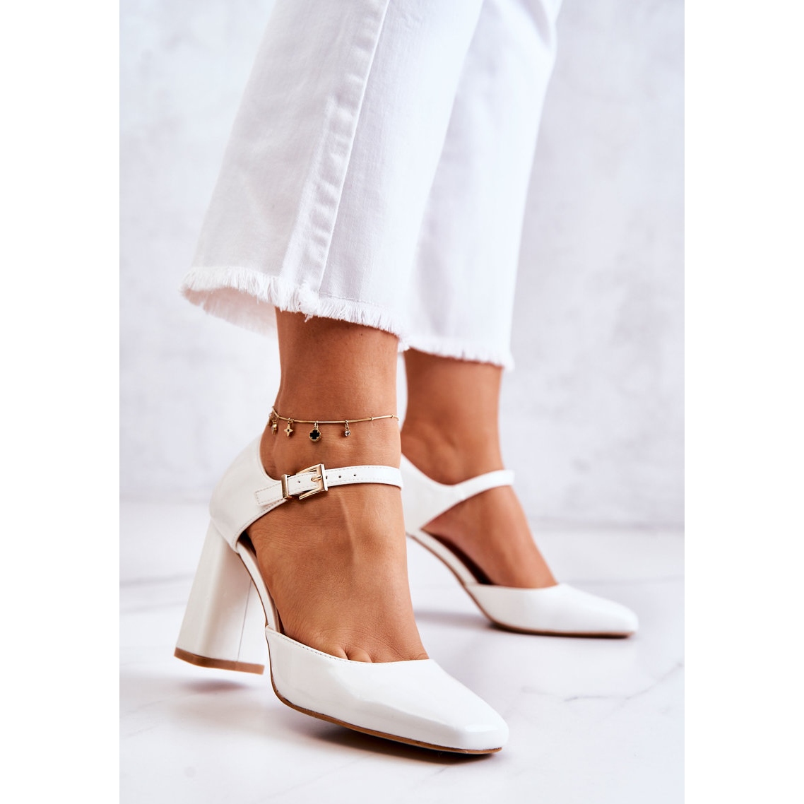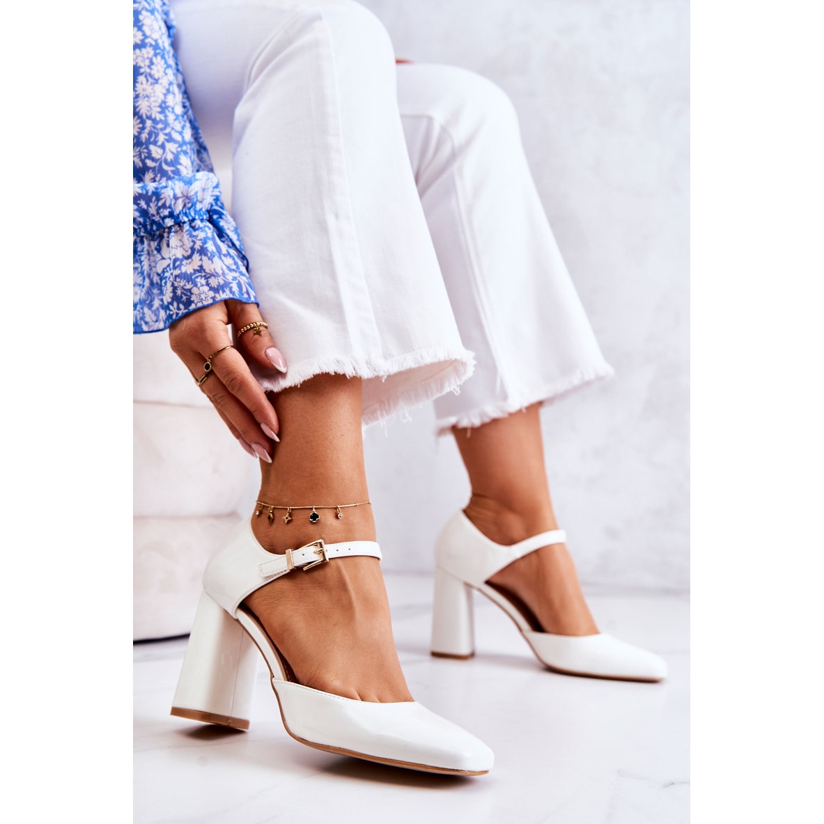 Aceste pompe sunt prinse în jurul gleznei cu o curea reglabilă cu cataramă, care permite o potrivire perfectă la orice picior. Nasul pătrat le conferă un caracter modern, în timp ce culoarea albă le face un element universal al oricărui stil. Se potrivesc perfect atât cu pantaloni largi, eleganti, cât și cu o rochie în stil jachetă.