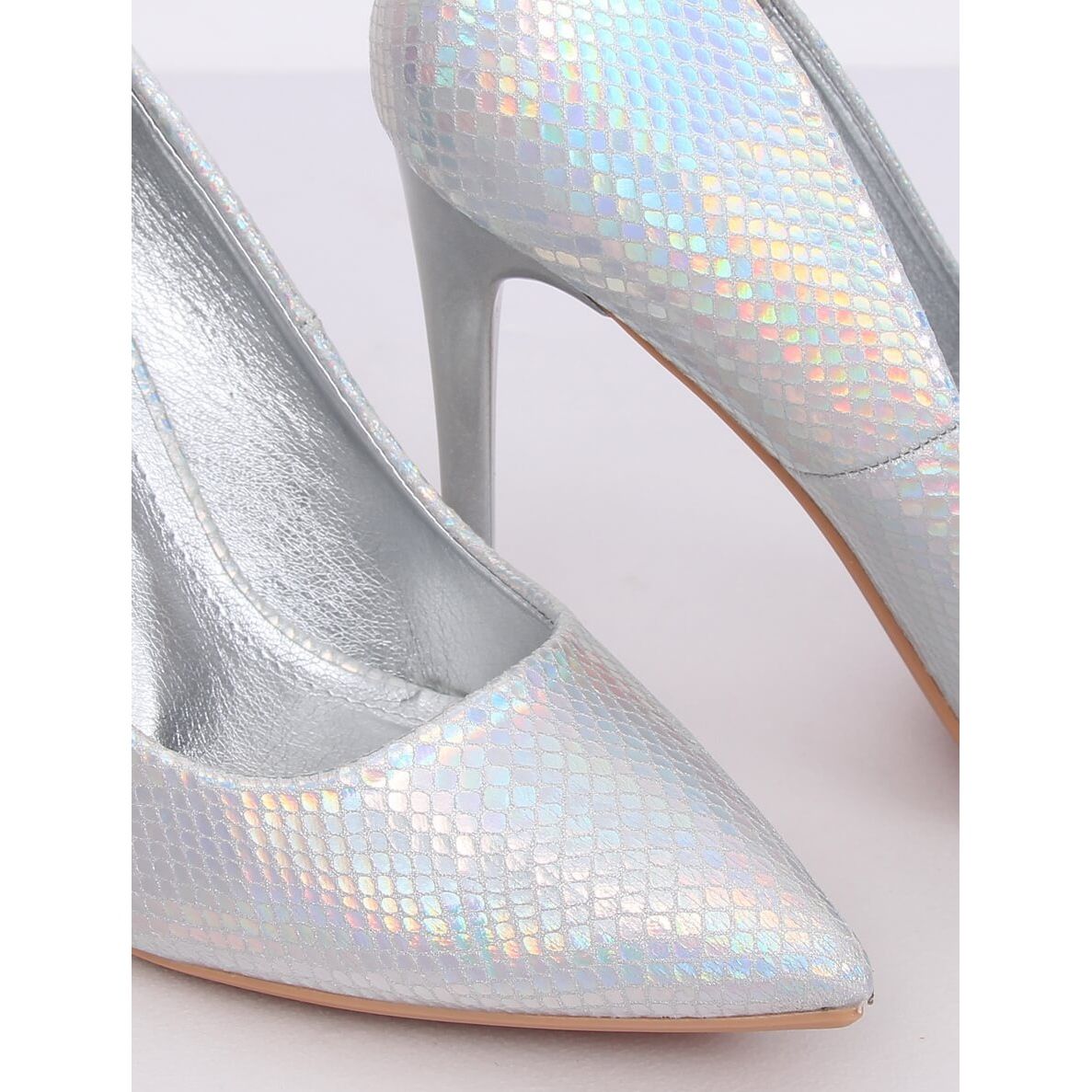 Pompele stiletto holografice argintii NF-52 Silver sunt o alegere perfectă pentru femeile care doresc să iasă în evidență în mulțime. Acești pantofi fenomenali încântă nu numai cu finisajul lor frumos, holografic, care strălucește cu diferite culori în funcție de lumină, ci și cu designul lor subțire, cu vârfuri ascuțite delicate. Un stiletto înalt de 10,5 cm adaugă eleganță și prelungește silueta, făcând fiecare femeie să se simtă specială în ele.