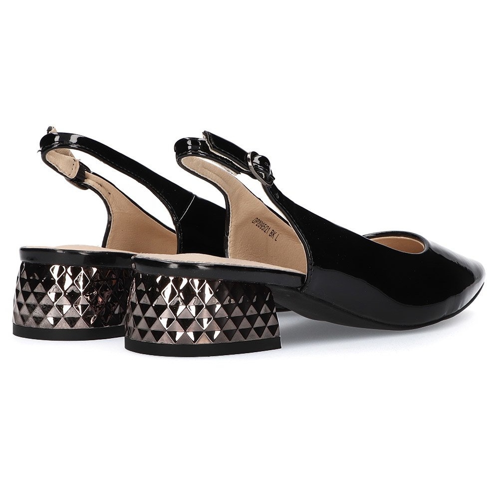 Interiorul pantofului finisat cu piele ecologica garanteaza confort, iar pielea naturala din brant asigura o ventilatie corespunzatoare a picioarelor. Pompele au și o închidere practică cu cataramă, care permite o potrivire perfectă pe picior.