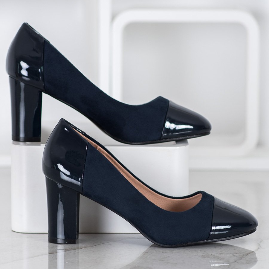 Pompele se remarcă printr-un toc jos, de 7 centimetri, sub formă de bloc, care îi face confortabil de purtat toată ziua. Culoarea lor neutră bleumarin le face să se potrivească perfect în diverse stiluri, atât formale, cât și casual.