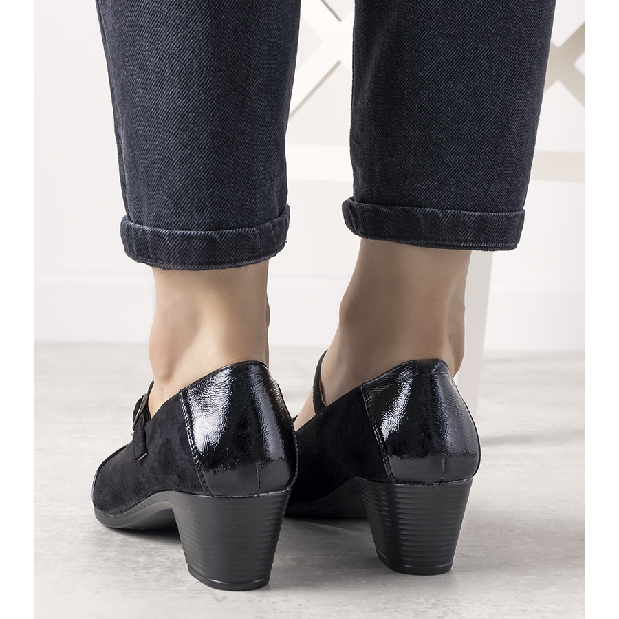 Descoperă eleganța și confortul cu pantofii negri cu toc de la modelul Dessert. Acesti pantofi rafinati, confectionati dintr-o combinatie de piele ecologica de piele intoarsa si piele ecologica lacuita, imbina perfect stilul cu manopera de inalta calitate.