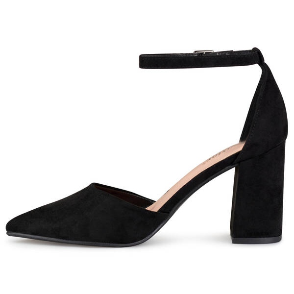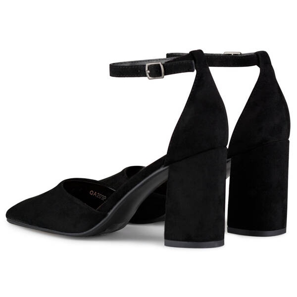 Caracteristica distinctivă a acestor pompe este fixarea confortabilă a gleznei cu o cataramă elegantă, care asigură stabilitate și permite o îmbrăcare ușoară. Tocul bloc de 8,5 cm inaltime adauga clasa si alungeste perfect picioarele, iar varful ascutit subliniaza caracterul feminin al incaltamintei.