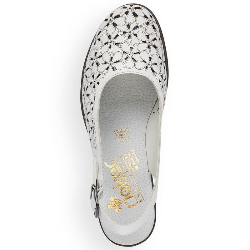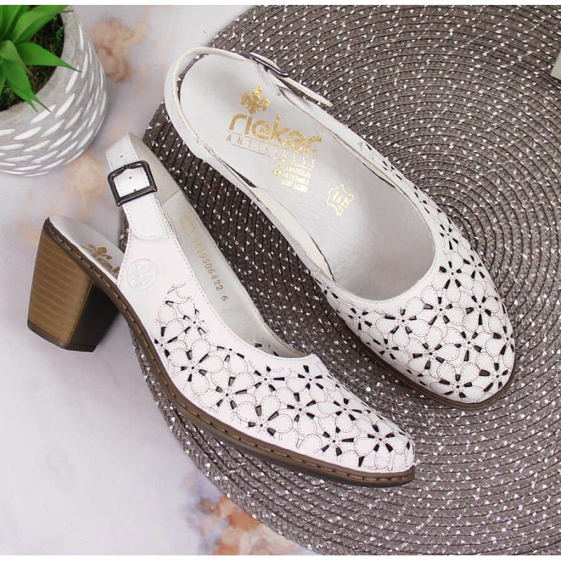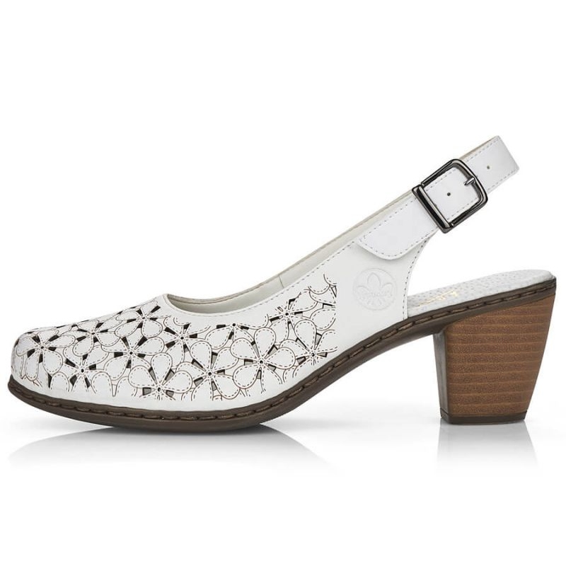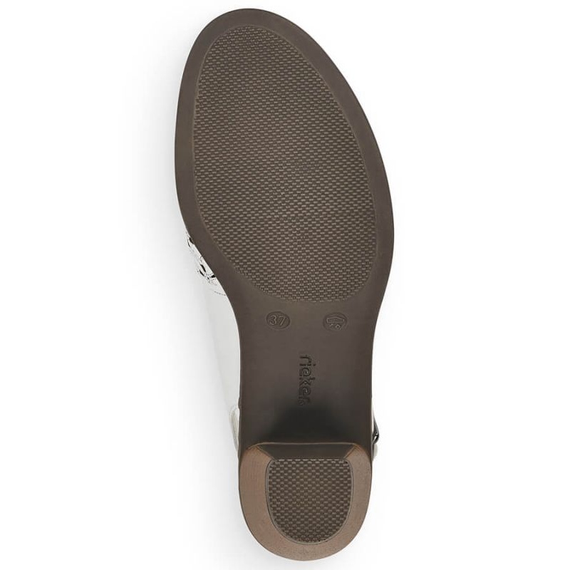 Sandale din piele Openwork Rieker în RKR531A în alb - eleganță și confort pentru vară. Supertul delicat, deschis, cu un motiv floral, oferă un caracter ușor, feminin, iar pielea naturală asigură respirabilitatea și durabilitatea. Un călcâie stabilă de 6 cm înaltă adaugă o curățare feminină, în timp ce are grijă de confort în timpul unei purtări mai lungi.