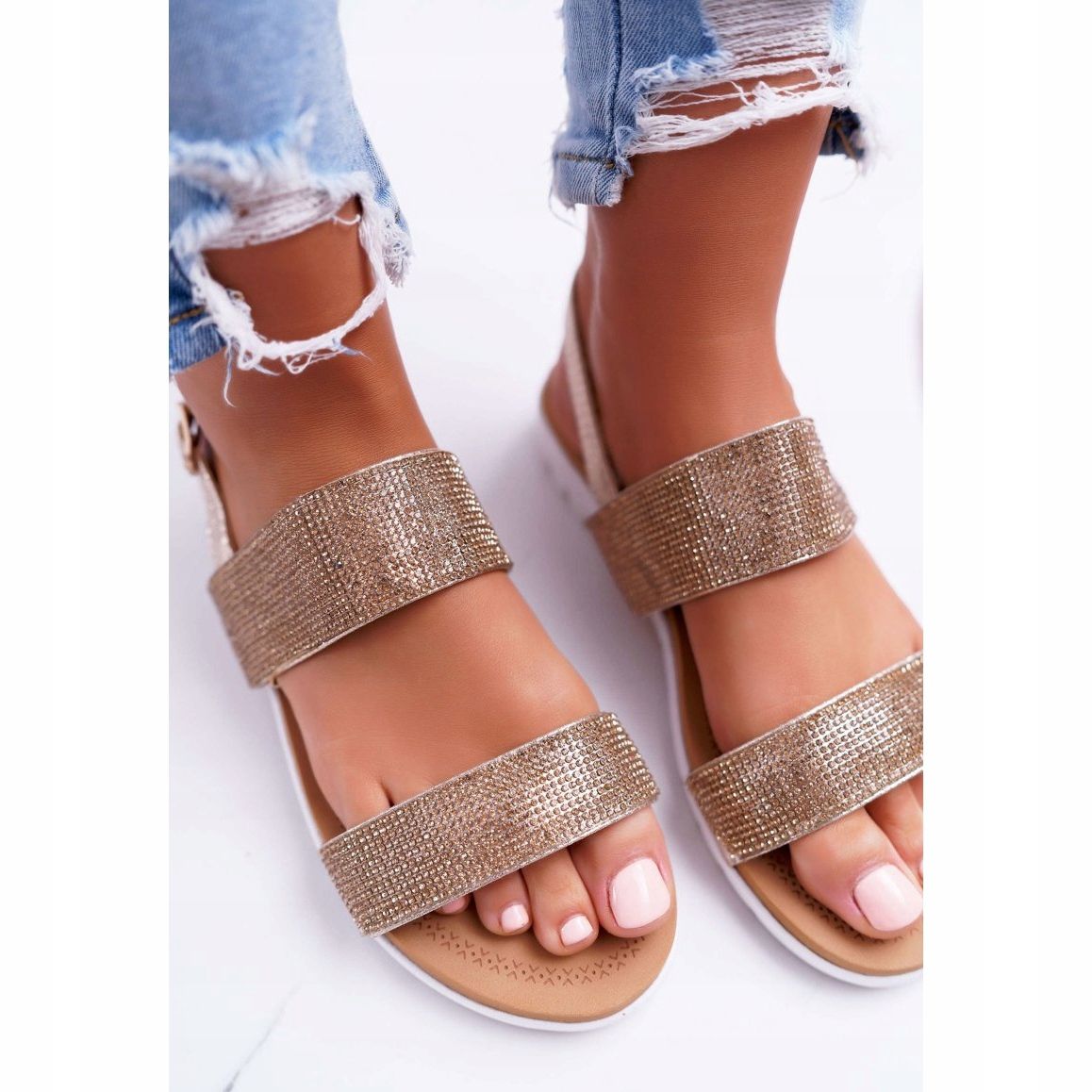 Descoperă confort și stil unic cu sandalele Lu Boo aurii, decorate cu zirconi frumoase! Aceste sandale plate de dama sunt alegerea perfecta pentru zilele calduroase care se apropie cu pasi repezi. Designul lor elegant, clasic, le face să se potrivească perfect cu diverse stiluri, atât pentru utilizarea de zi cu zi, cât și pentru ocazii speciale.