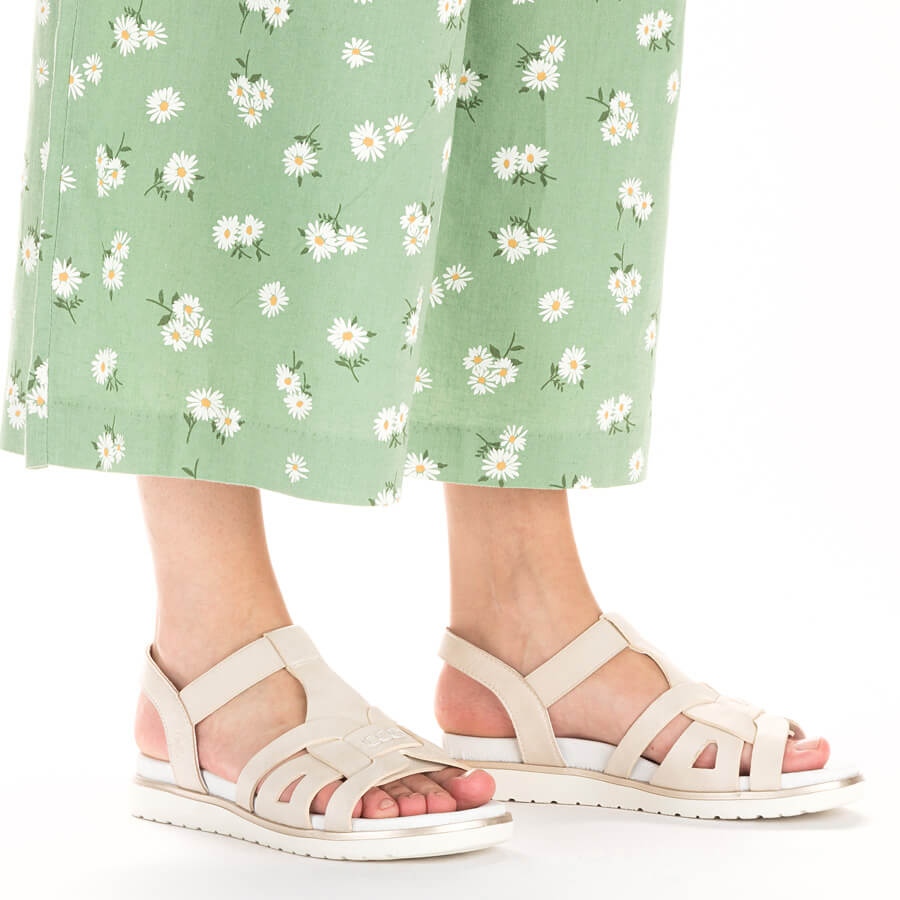 Descoperiți confort și stil excepțional cu sandalele de damă Rieker V5052-80 într-o nuanță elegantă de ecru. Aceste sandale slip-on sunt combinația perfectă de clasic și modern, perfectă atât pentru stilurile de zi cu zi, cât și pentru stilurile mai formale.