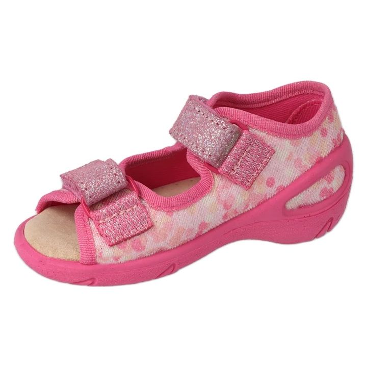 Sandalele Befado au fost create pentru fetele active care au nevoie de încălțăminte stilată și funcțională. Culoarea roz cu sclipici delicat ii face pe cei mici dornici sa poarte acesti papuci, iar calcaiul rigid ofera suport adecvat calcaiului, care este crucial in timpul utilizarii intensive.