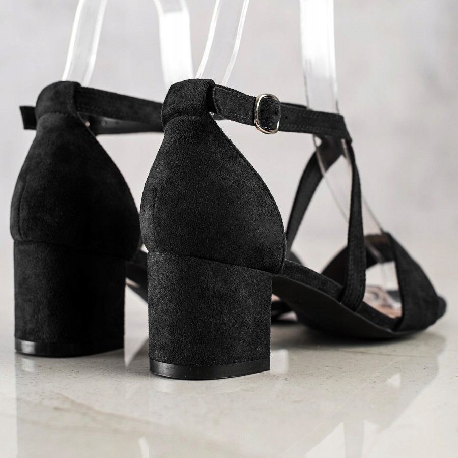 Va prezentam sandale negre cu bretele marca Sergio Leone, care se vor potrivi perfect stilurilor de vara. Confectionate din piele intoarsa ecologica de inalta calitate, acestea imbina eleganta si confortul. Designul lor clasic, cu degete deschise și toc încorporat, decorat cu o cataramă aurie la încheietura mâinii, le face o alegere perfectă pentru diverse ocazii - de la petreceri de seară până la sărbători.