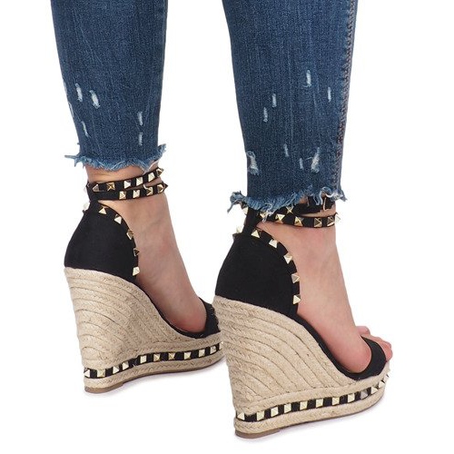 Sandalele cu pană negre Lov'it cu știfturi sunt alegerea perfectă pentru zilele de vară, combinând confortul cu eleganța. Acești pantofi unici, confecționați din material asemănător pielii de înaltă calitate, arată extrem de elegant datorită detaliilor impresionante cu împânzire. Degetele deschise ofera respirabilitate si in acelasi timp fac sandalele usoare.
