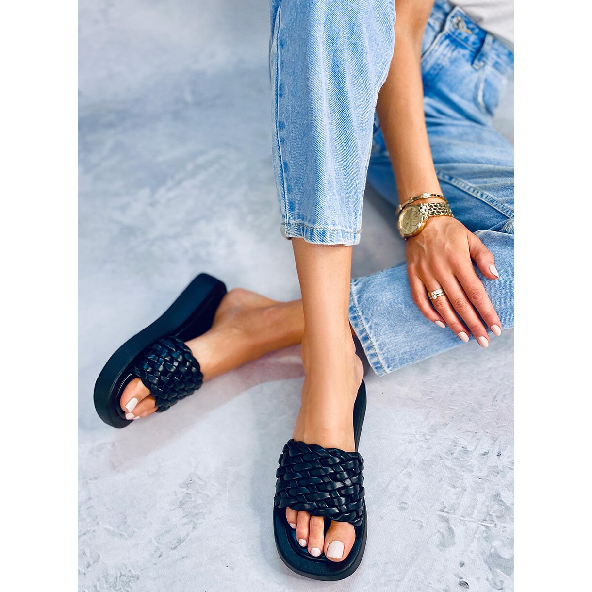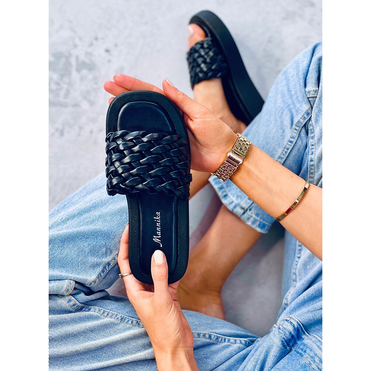 Slapii Elida Black se disting prin bretele largi țesute, care nu numai că asigură o potrivire perfectă, ci afectează și estetica întregii încălțăminte. O talpă plată de 3 centimetri garantează confort în timpul plimbărilor de vară, ceea ce le face o alegere ideală pentru utilizarea de zi cu zi. Fără o cutie pentru degete, acești șlapi permit picioarelor să respire, ceea ce este deosebit de important în zilele calde.