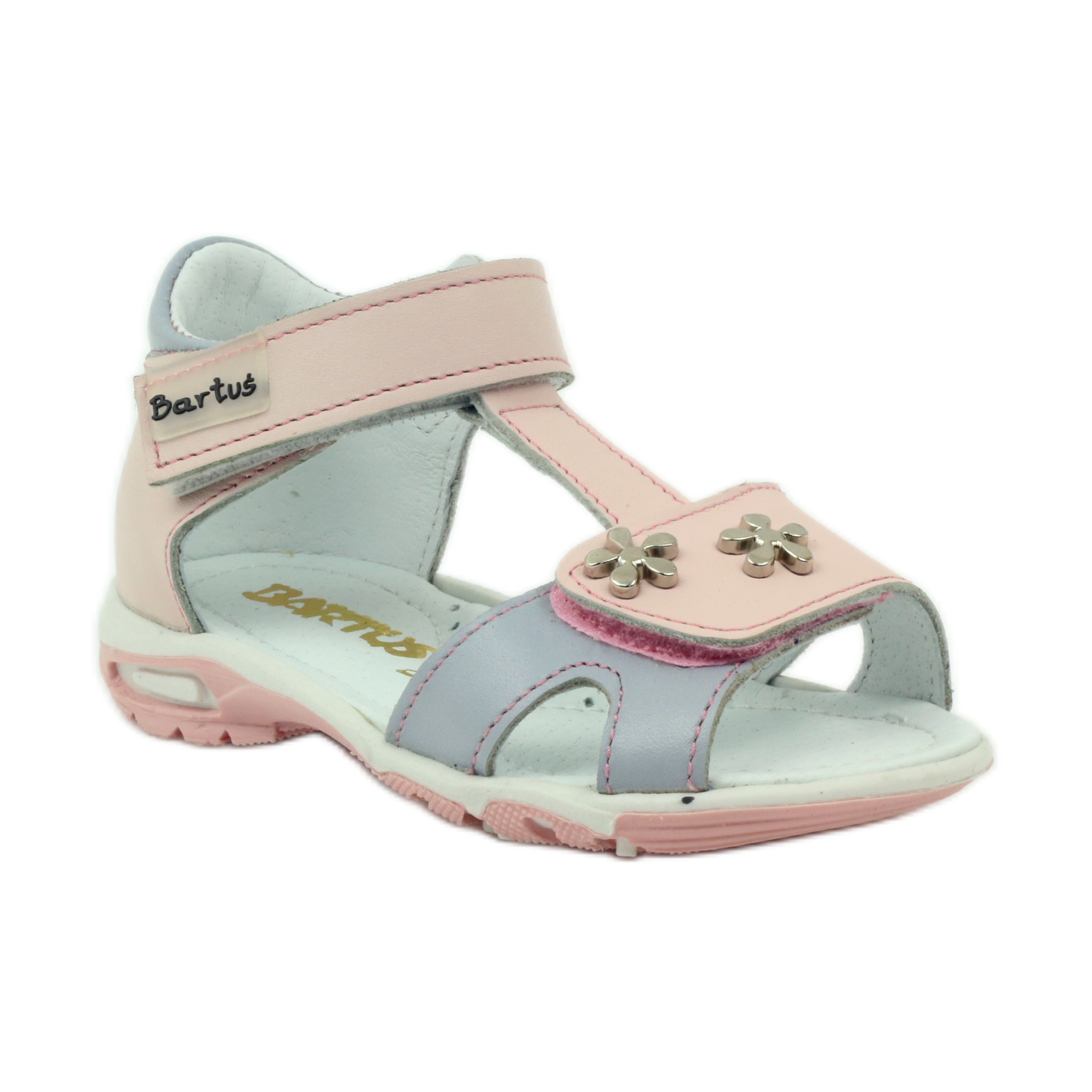 Producătorul Bartuś, cunoscut pentru atenția acordată calității și sănătății celor mai tineri, s-a asigurat că aceste sandale au marca „Picior sănătos”, ceea ce confirmă că sunt potrivite pentru picioarele în curs de dezvoltare ale copiilor. Disponibil într-o culoare frumoasă roz și gri cu flori metalice decorative, cu siguranță vor atrage orice fetiță.