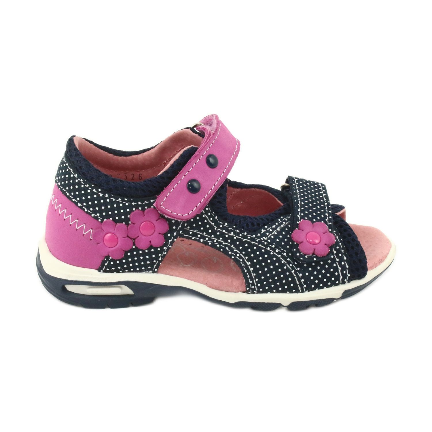 Aceste sandale fermecătoare sunt disponibile în două culori: bleumarin și roz, decorate cu mici puncte albe și decorațiuni sub formă de flori roz. Datorită închiderii cu velcro, acestea pot fi ajustate cu ușurință pe piciorul copilului, ceea ce mărește confortul de utilizare. Tocul rigid asigură o stabilizare adecvată, iar branțul profilat face ca sandalele să se potrivească perfect anatomiei piciorului.