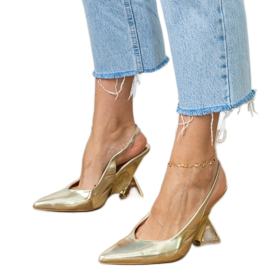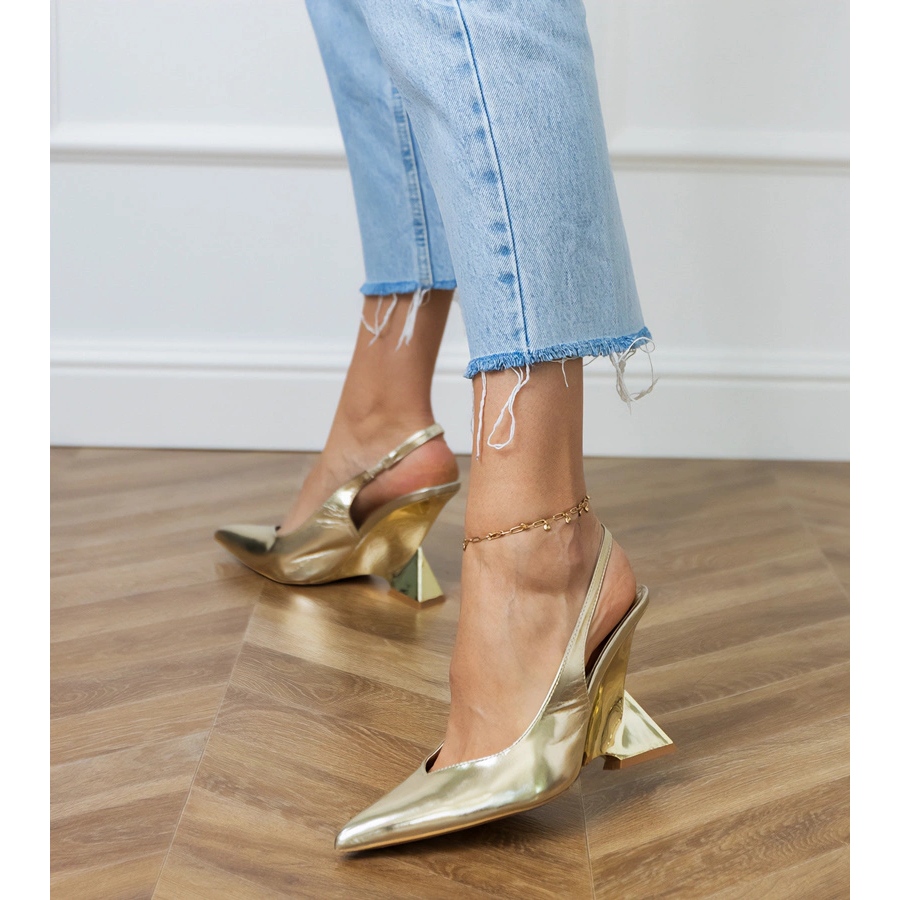 Investiți în sandale de aur pe o pană geometrică și adăugați o mică strălucire în garderoba dvs.!