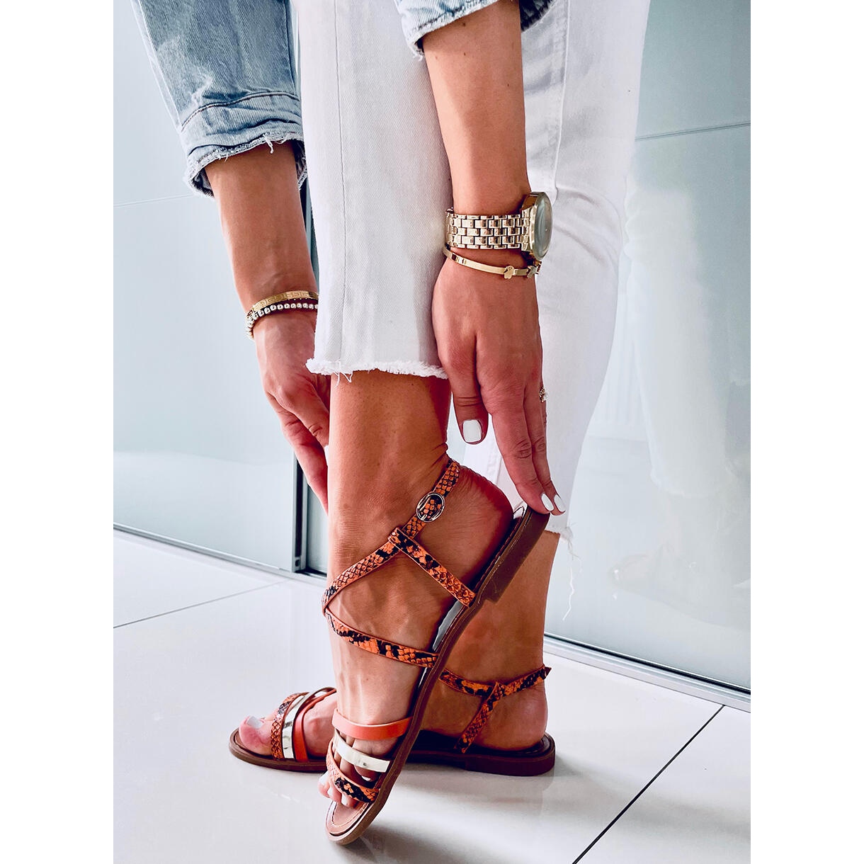 Descoperă sandalele de damă Bavi Orange într-o culoare portocalie uimitoare, care vor fi un adevărat decor al ținutei tale de vară! Aceste sandale plate unice se disting nu numai prin nuanța lor intensă, ci și printr-un accent metalic care le adaugă eleganță și stil.