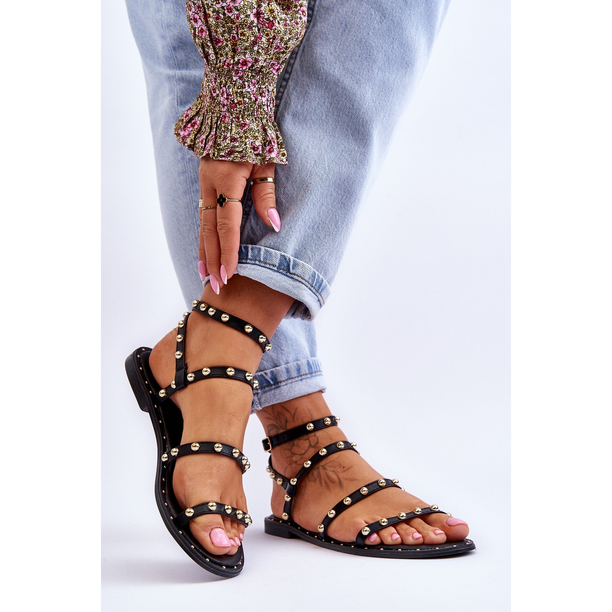 Confortul la purtare este asigurat de un design bine gândit - sandalele sunt prinse în jurul gleznei cu o curea reglabilă cu cataramă, care permite o potrivire perfectă a încălțămintei pe picior. Varful este deschis si rotunjit, ceea ce este perfect pentru zilele caniculare, oferind picioarelor ventilatia necesara. Pentru un farmec suplimentar, producătorul a folosit decorațiuni decorative în jurul tălpii plate, care este realizată din cauciuc cu profil antiderapant, garantând stabilitate pe orice suprafață.