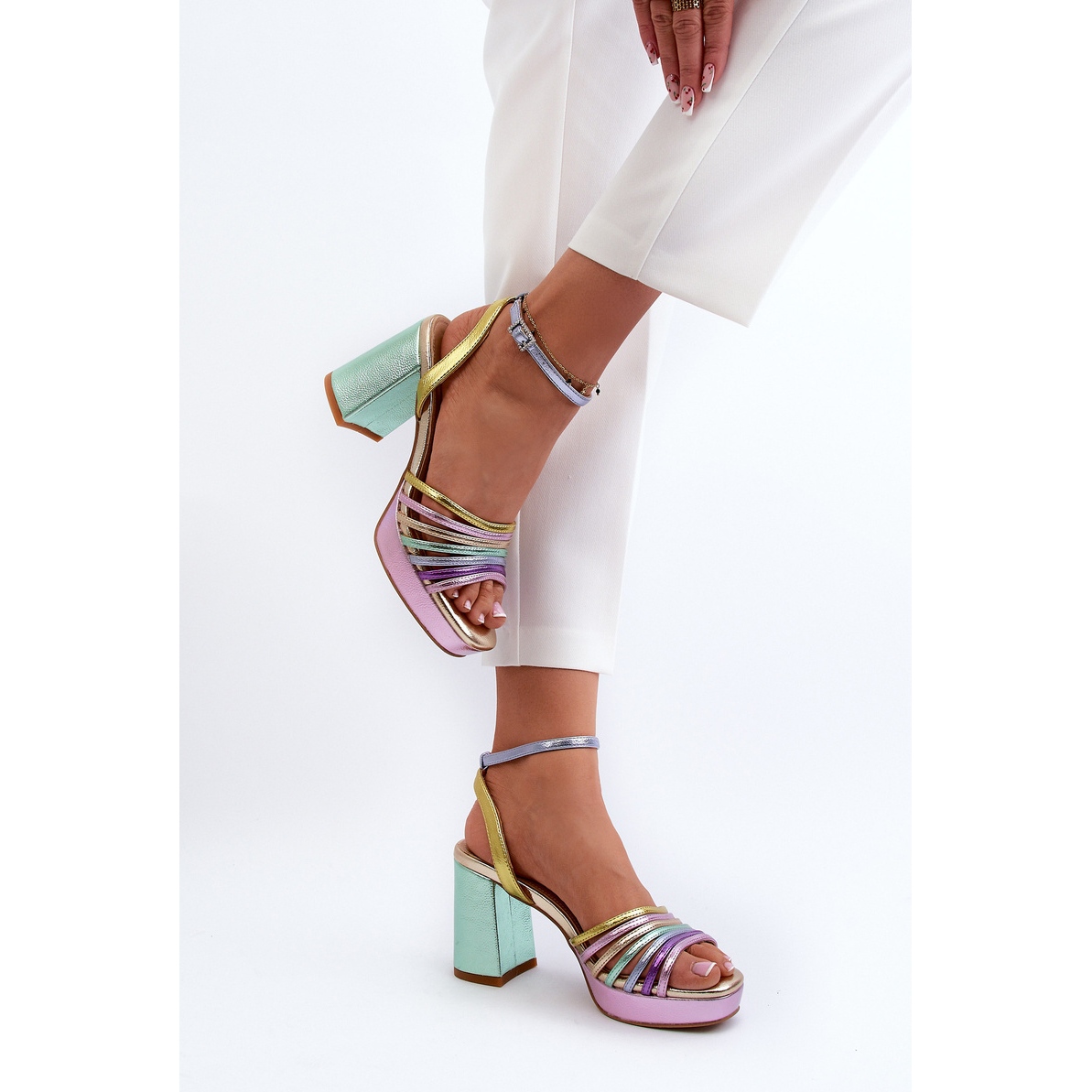 În față, sandalele sunt decorate cu curele conectate, ceea ce le oferă un personaj subtil și elegant. Cureaua reglabilă cu catarama permite o potrivire precisă a piciorului, ceea ce asigură un confort excepțional de purtare toată ziua. Înălțimea călcâiului de 9 cm înseamnă că sandalele subliniază perfect figura, în timp ce nu renunță la comoditate.