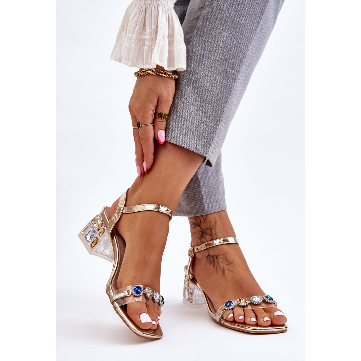 Așezate pe un toc bloc scăzut, decorat, aceste sandale asigură stabilitate și confort la purtare. Jeturile decorative din față le conferă o strălucire unică, potrivindu-se perfect cu diverse stiluri. O curea reglabilă cu cataramă în jurul gleznei permite o potrivire perfectă la picior, ceea ce mărește confortul la purtare.
