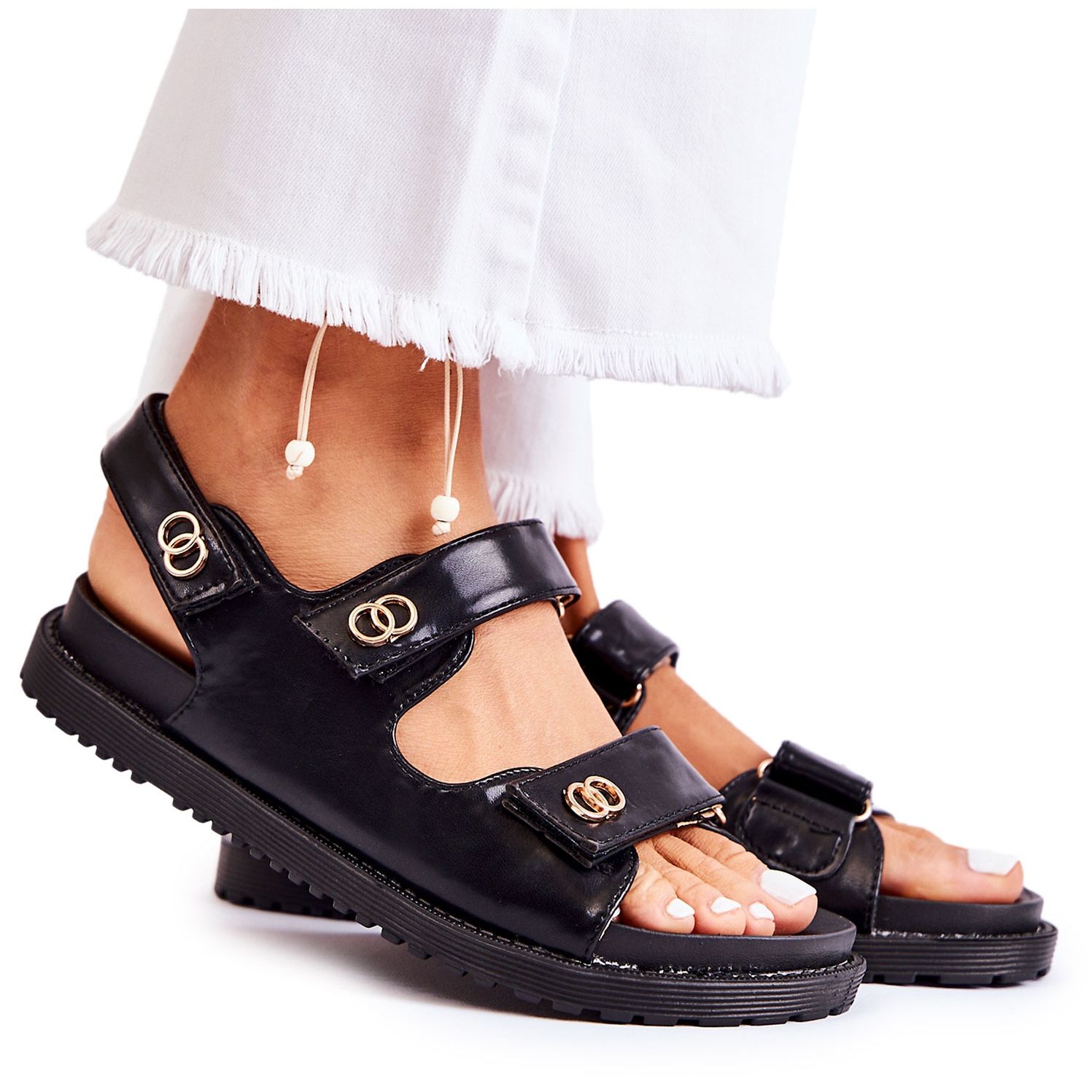 Modelul este echipat cu trei curele prinse cu Velcro, ceea ce permite o reglare usoara si rapida. Un avantaj in plus il reprezinta decoratiunile subtile pe bretelele din fata, care dau sandalelor un caracter unic. Brantul din piele ecologica este profilat, ceea ce garanteaza confort atunci cand este purtat pe perioade lungi de timp. Sandalele cu talpa plata, inaltime de 2 cm, ofera stabilitate, ceea ce le face perfecte pentru plimbarile de zi cu zi sau excursiile in afara orasului.
