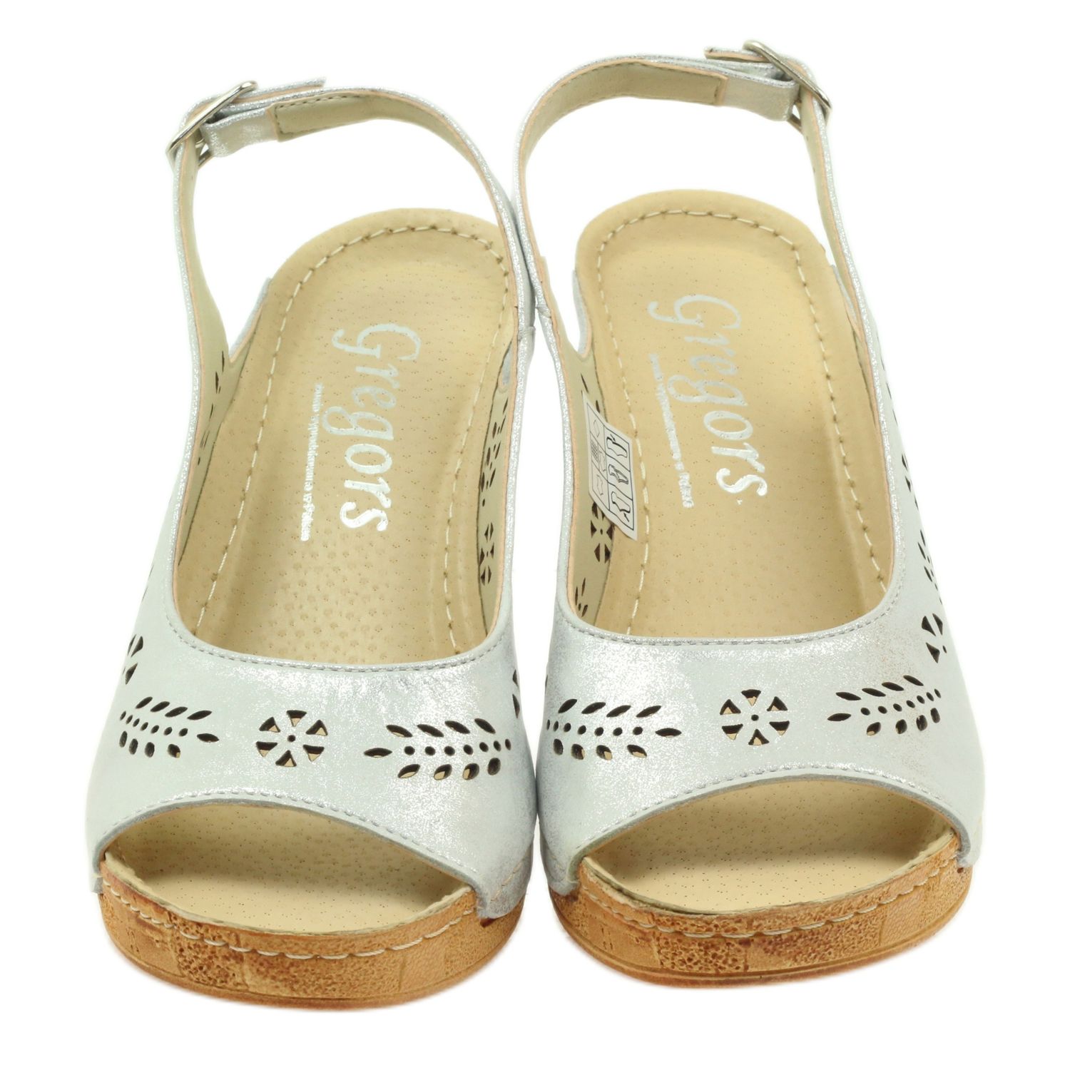 Iată o alegere excelentă pentru fiecare femeie la modă - sandale Gregors 709 cu pană din piele metalizată într-o culoare argintie elegantă. Aceste sandale de dama, produse de renumita companie poloneza Gregors, sunt o combinatie de stil si confort, perfecte pentru tinutele de zi cu zi si ocaziile speciale.