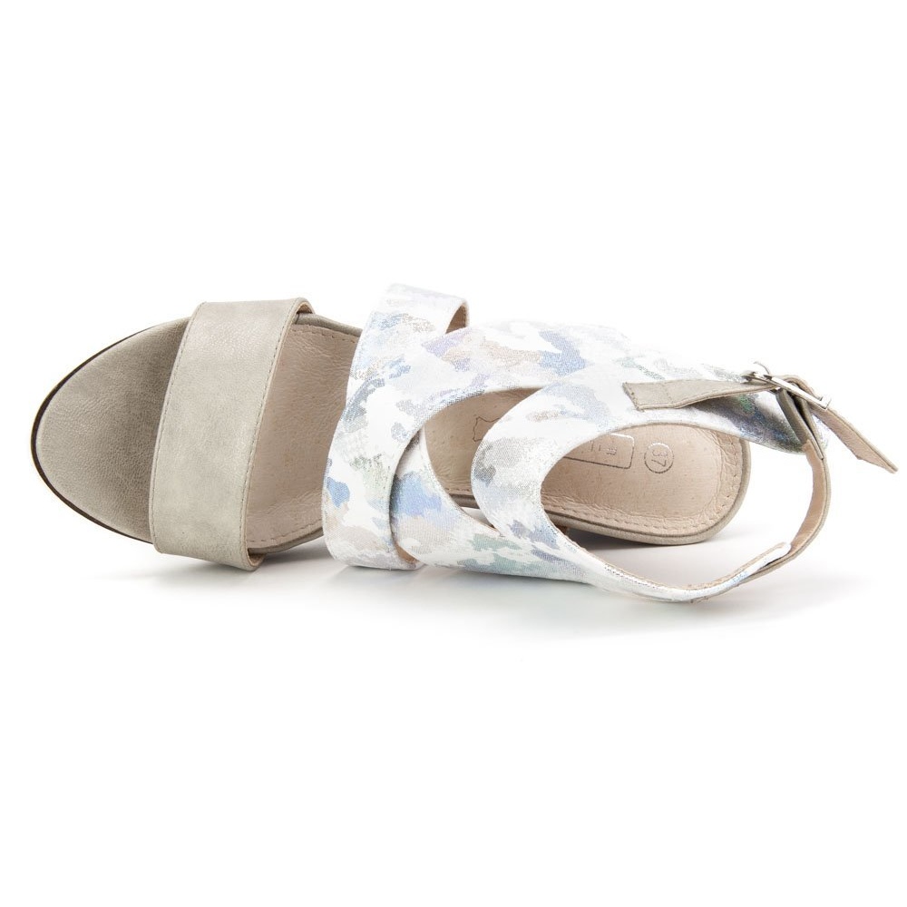 Sandalele au un vârf în formă de migdale, care adaugă farmec feminin. Tocul cu pană înalt de 8,5 cm și platforma înaltă de 1,5 cm nu numai că alungesc optic picioarele, dar asigură și stabilitate și confort de utilizare. Talpa alba contrasteaza perfect cu finisajul multicolor, ceea ce face ca sandalele sa se potriveasca perfect cu diverse stiluri.