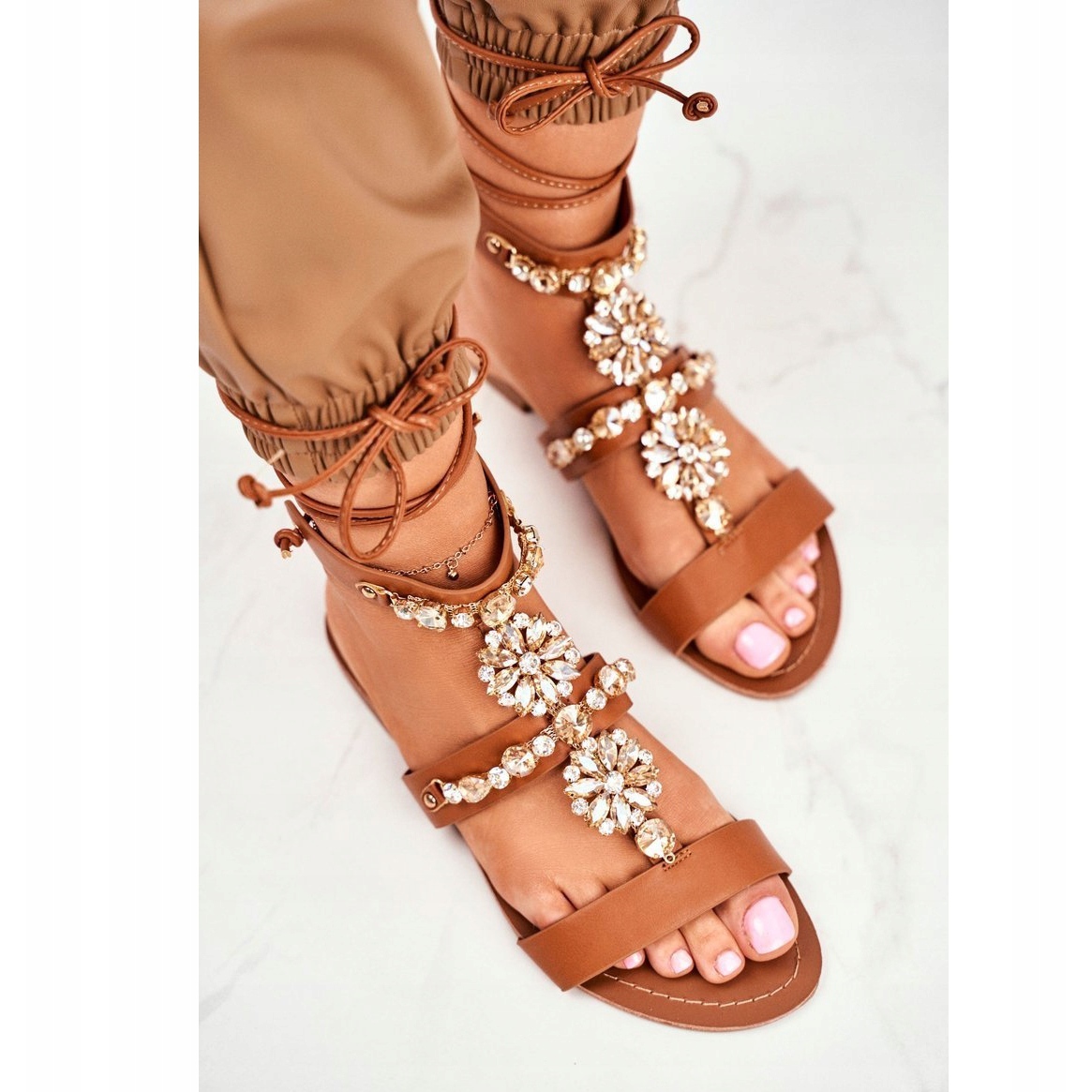 Detalii: Sandale Gladiator pentru femei, cu cristale camel Hype maro