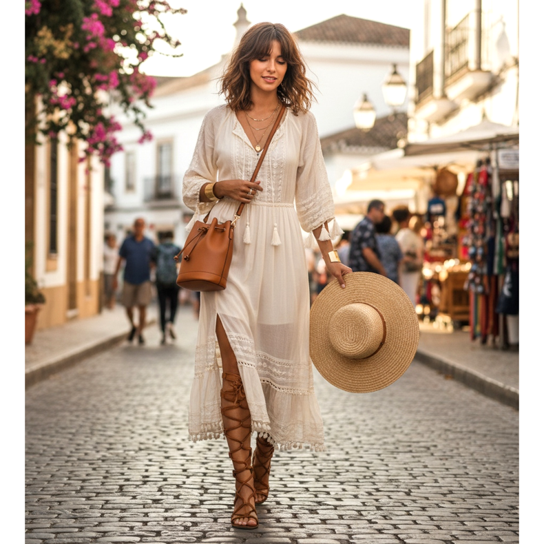 O rochie aerisită în stil boho cu broderie sau franjuri se armonizează în mod natural cu estetica din piele a pantofilor gladiatori. Alege sandale coniac sau maro natural cu o rochie în nuanțe de ecru, teracotă sau verde aprins. Acest set funcționează atât la cursul de pe plajă, cât și la târgurile sau vernisajele de vară.