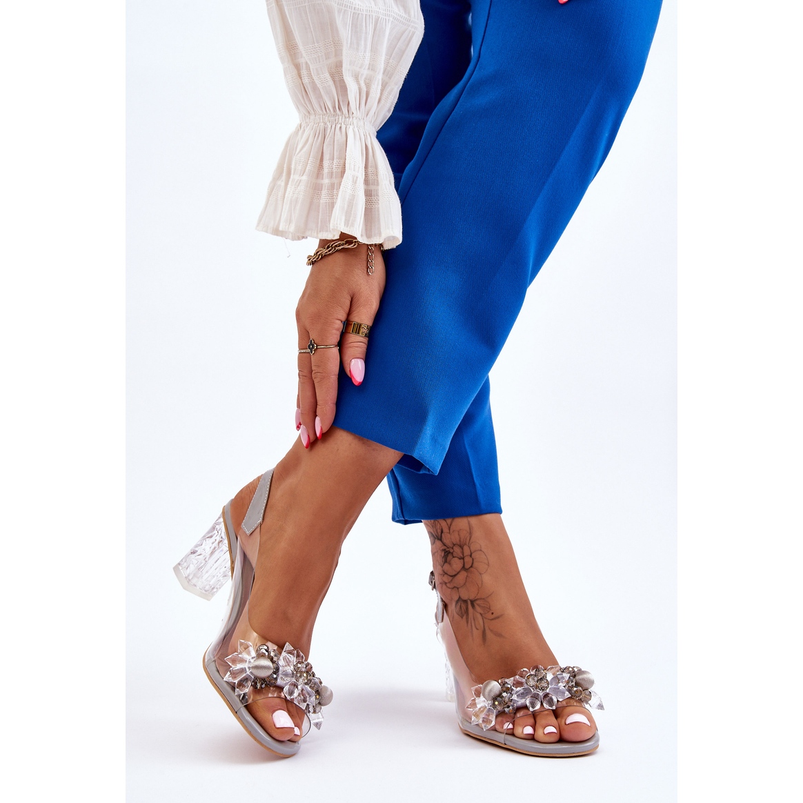Pantofii se disting printr-un toc transparent sub forma unui bloc inalt de 7 cm, care le confera un aspect modern. Partea din față a sandalelor este decorată cu imitații elegante de cristale și margele, care atrag atenția și conferă șic feminin. Datorită branțului moale, profilat din piele naturală, vă veți putea bucura de o purtare confortabilă în fiecare zi.