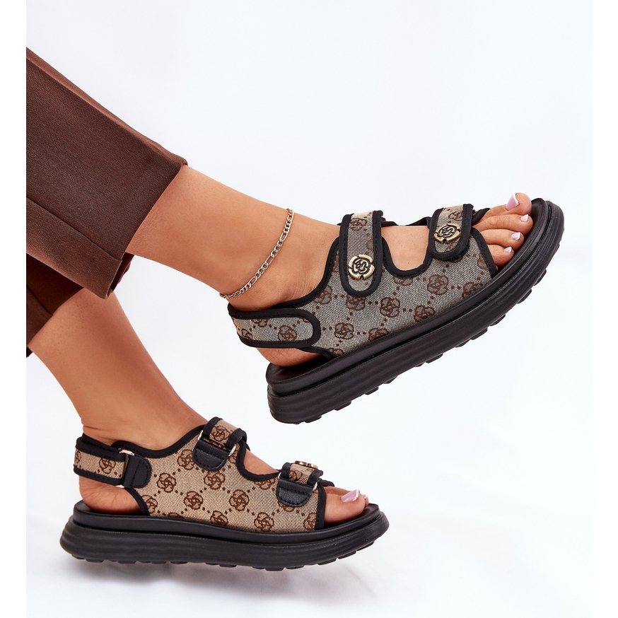 Detalii: Sandale materiale modelate pentru femei cu detalii aurii-negre bej