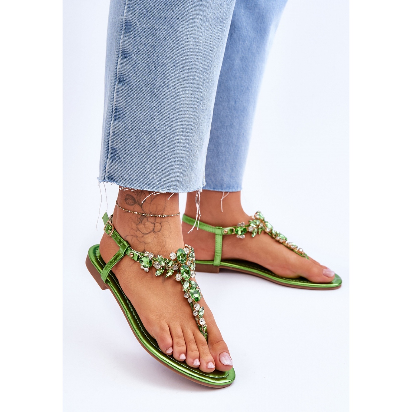 Sandalele flip-flops de damă sunt alegerea perfectă pentru zilele mai calde! Sunt confectionate din piele ecologica. Au decoratiuni pe ansamblu sub forma de pietre si strasuri. Prins în jurul gleznei cu o curea reglabilă cu cataramă. Așezat pe un toc plat. Brantul confortabil este din piele ecologica.