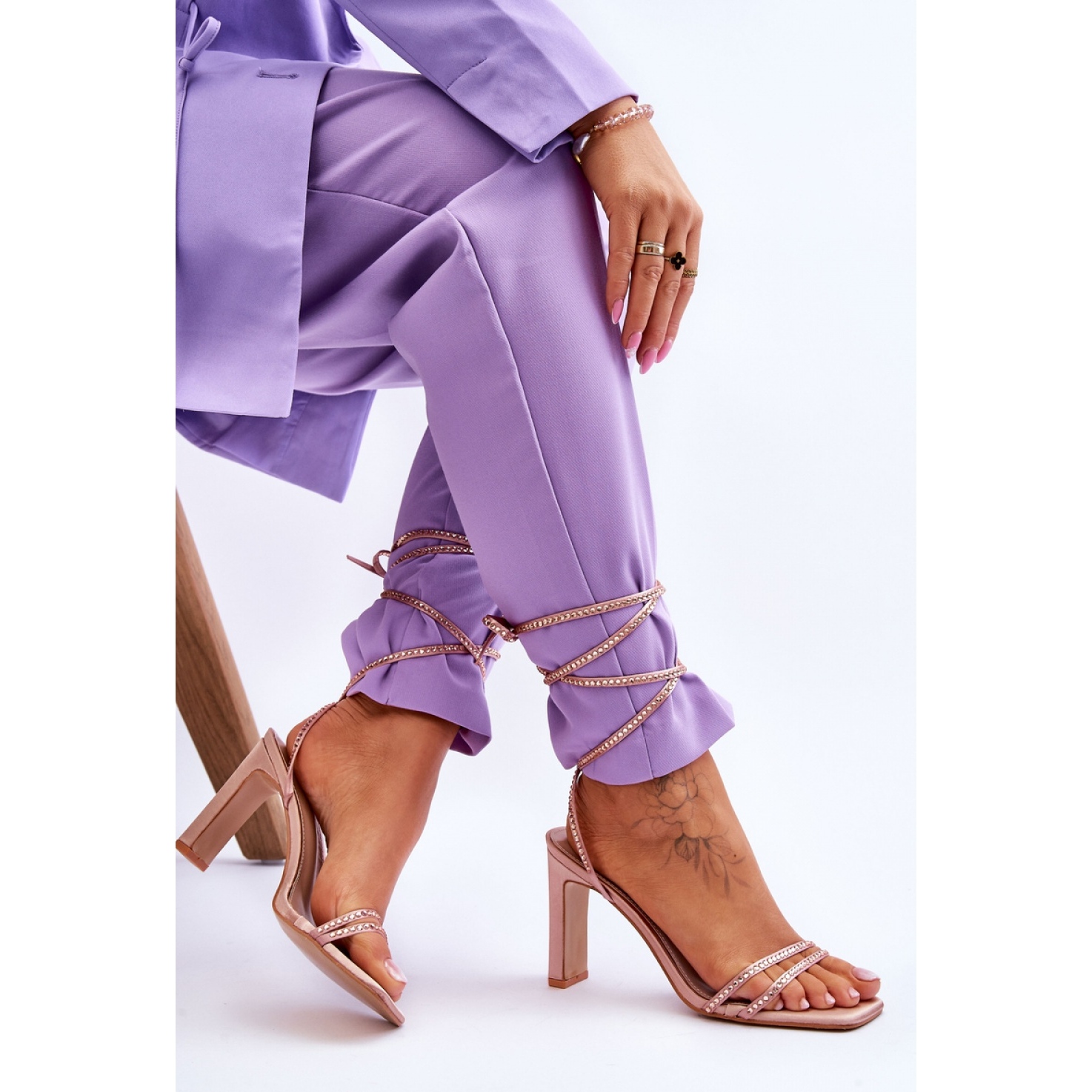 Sandalele comode și unice sunt visul tuturor. Acești pantofi sunt confecționați dintr-o parte superioară din material textil. In plus, au jeturi decorative care imita zirconii. Legat în jurul gambei. Brantul moale din piele ecologica va oferi confort pentru o perioada indelungata. Tocul la modă cu o formă neregulată este, de asemenea, tuns cu material textil. Datorita dungilor subtiri, modelul este extrem de aerisit.