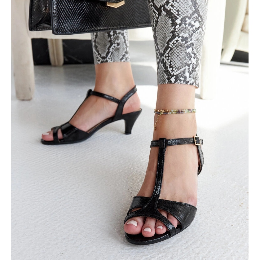 Tăierea înaltă, de 5 centimetri, în formă de știft înseamnă că sandalele lui Mislaw adaugă grație oricărei stilizări, subliniind forme feminine. Finisajul lăcuit într -o culoare neagră elegantă face ca aceste sandale să fie un complement perfect atât pentru rochii de vară, cât și pentru combinații mai casual.