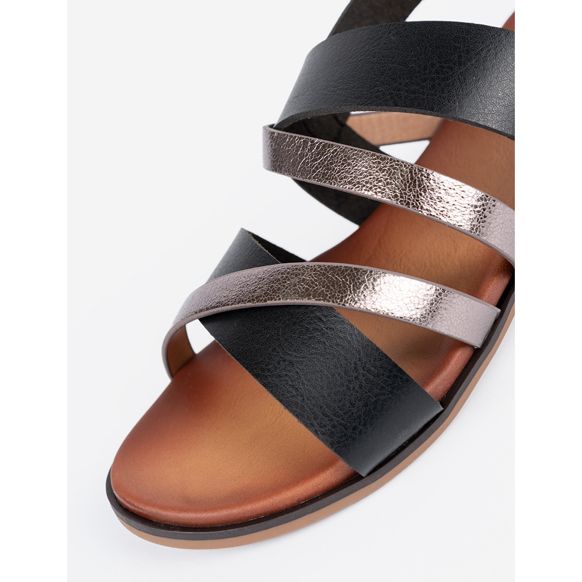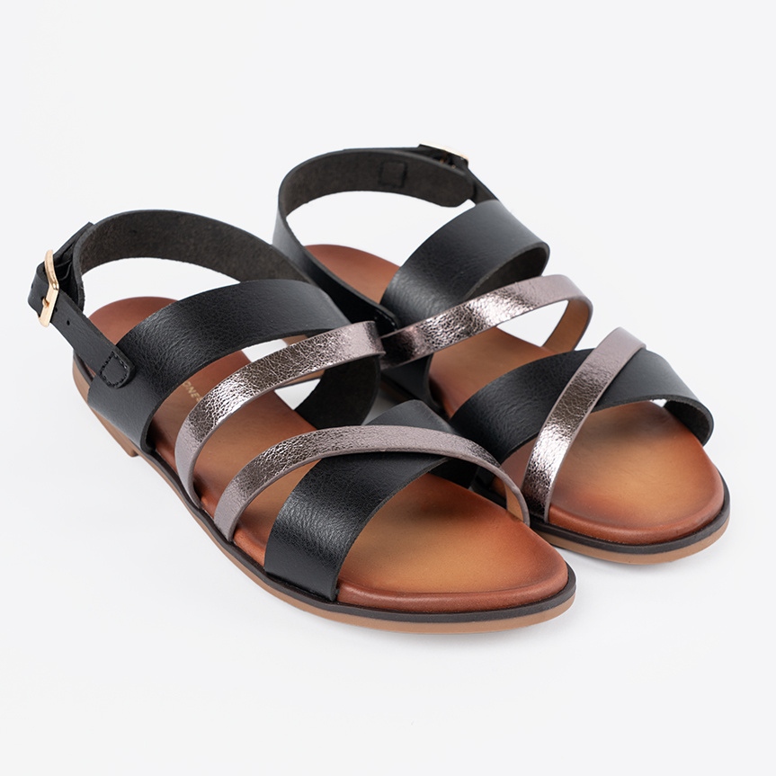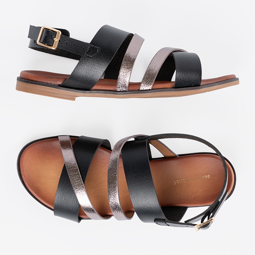 Sandalele negre se disting printr -un luciu subtil, metalic de dungi de argint, care le oferă caracter și le fac perfecte atât pentru rezultatele zilnice, cât și pentru ocazii elegante. Talpa din plastic oferă o aderență excelentă, iar un călcâi plat cu o înălțime de 2 cm face sandalele confortabile chiar și în timpul unei uzuri lungi.
