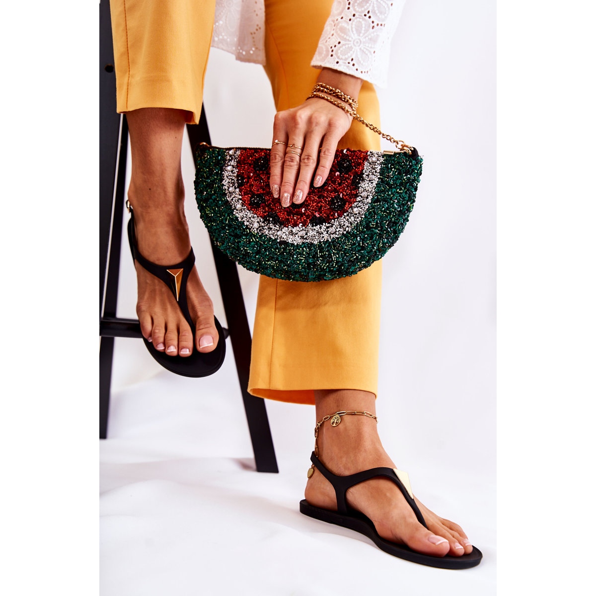 Sandalele au toc jos, plat, inalt de 1 cm, ceea ce le face confortabile si asigura libertatea de miscare. O curea reglabilă prinsă în jurul gleznei cu o cataramă practică vă permite să ajustați pantofii la picioare, ceea ce sporește în plus confortul la purtare. În mijloc există o emblemă caracteristică în formă de triunghi, care conferă întregului aspect un aspect modern.