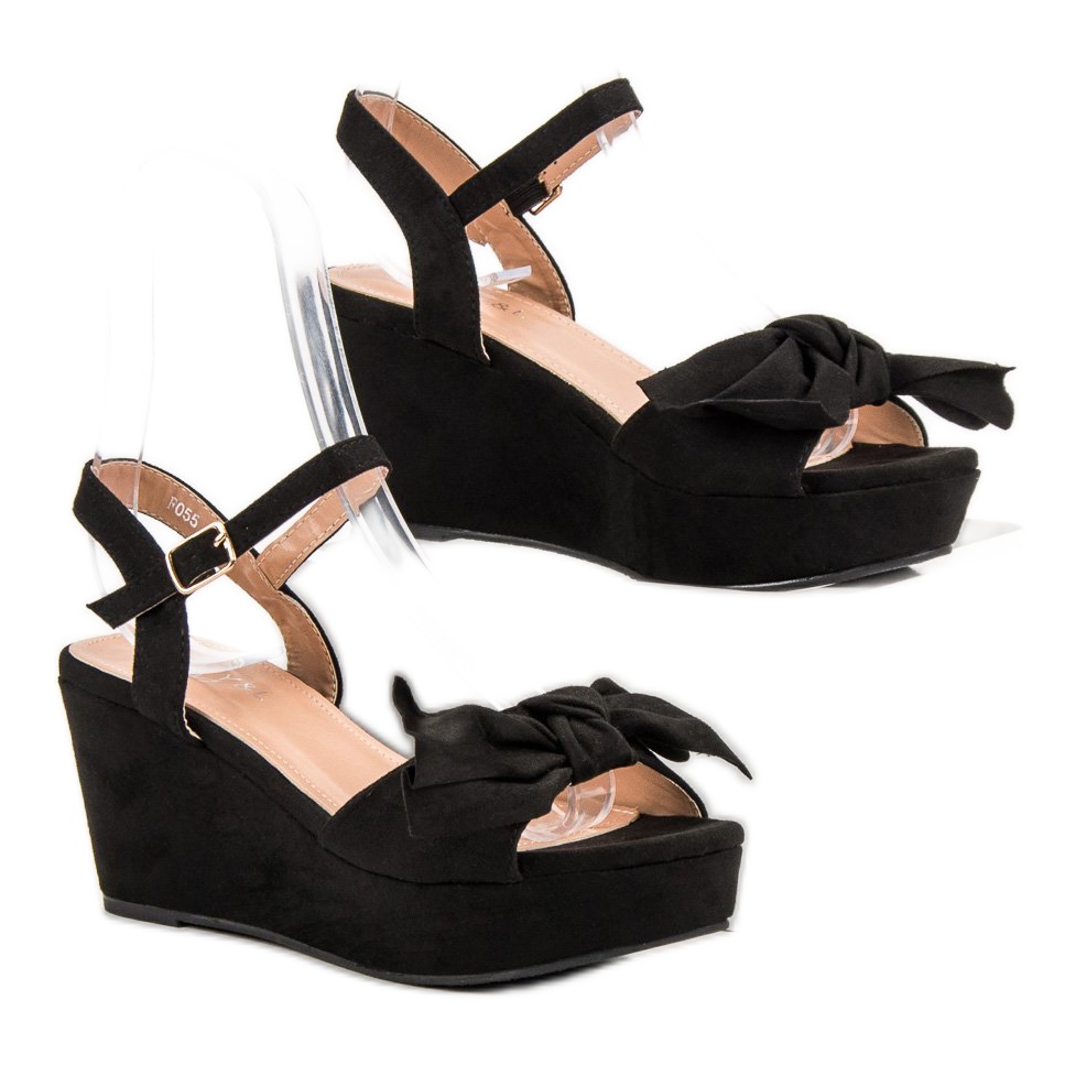 Sandalele sunt echipate cu o pană de 8 cm înălțime și o platformă suplimentară de 4 cm înălțime, ceea ce asigură un confort optim de purtare și un efect de slăbire. O închizătoare specială sub formă de cataramă și un detaliu sub formă de fundă le conferă un caracter unic, subliniind în același timp stilul lor elegant de modă.