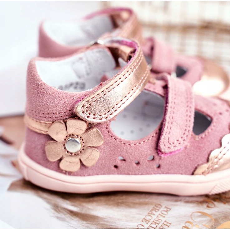Partea superioară a sandalelor este confecționată din piele naturală moale velur, care nu este doar plăcută la atingere, ci și durabilă. Abordarea unică a sănătății picioarelor copiilor este confirmată de semnul „Picior sănătos”, care simbolizează încălțămintea adecvată care sprijină dezvoltarea corespunzătoare a picioarelor acestora.
