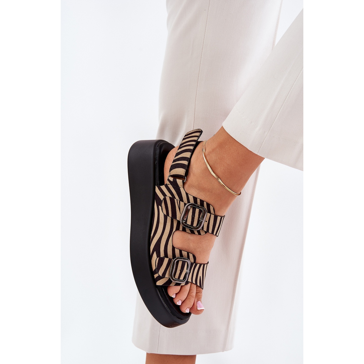 Detalii: Sandale pentru femei pe platformă și panouri cu catarame de zebră negre bej