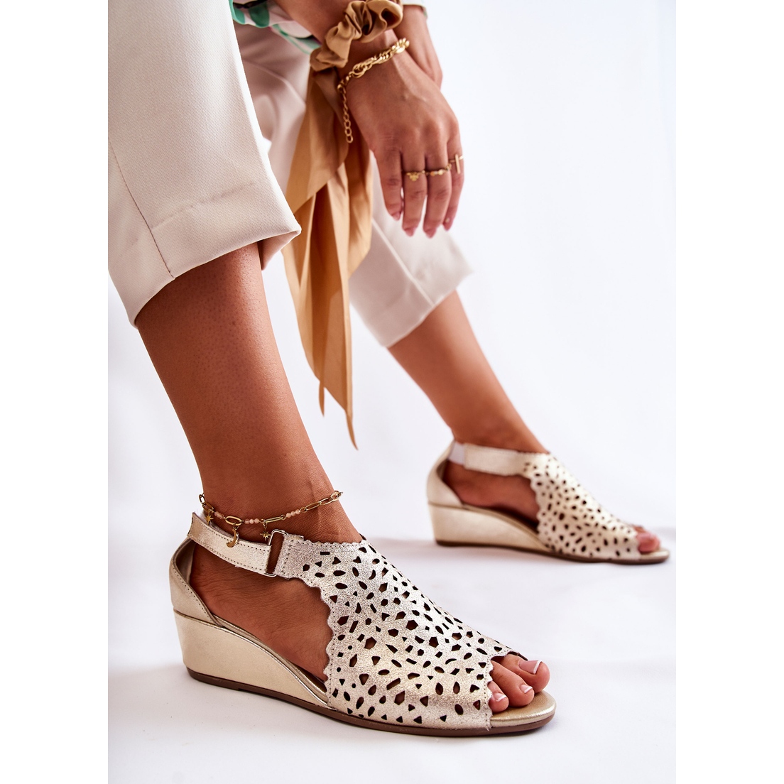 Descoperiți eleganța verii cu sandalele cu pană ajurate PA2 din piele aurii de la marca Sellena. Acesti pantofi eleganti de dama sunt confectionati din piele naturala, caracterizata printr-un model ajurat care asigura o ventilatie excelenta si confort in zilele caniculare.
