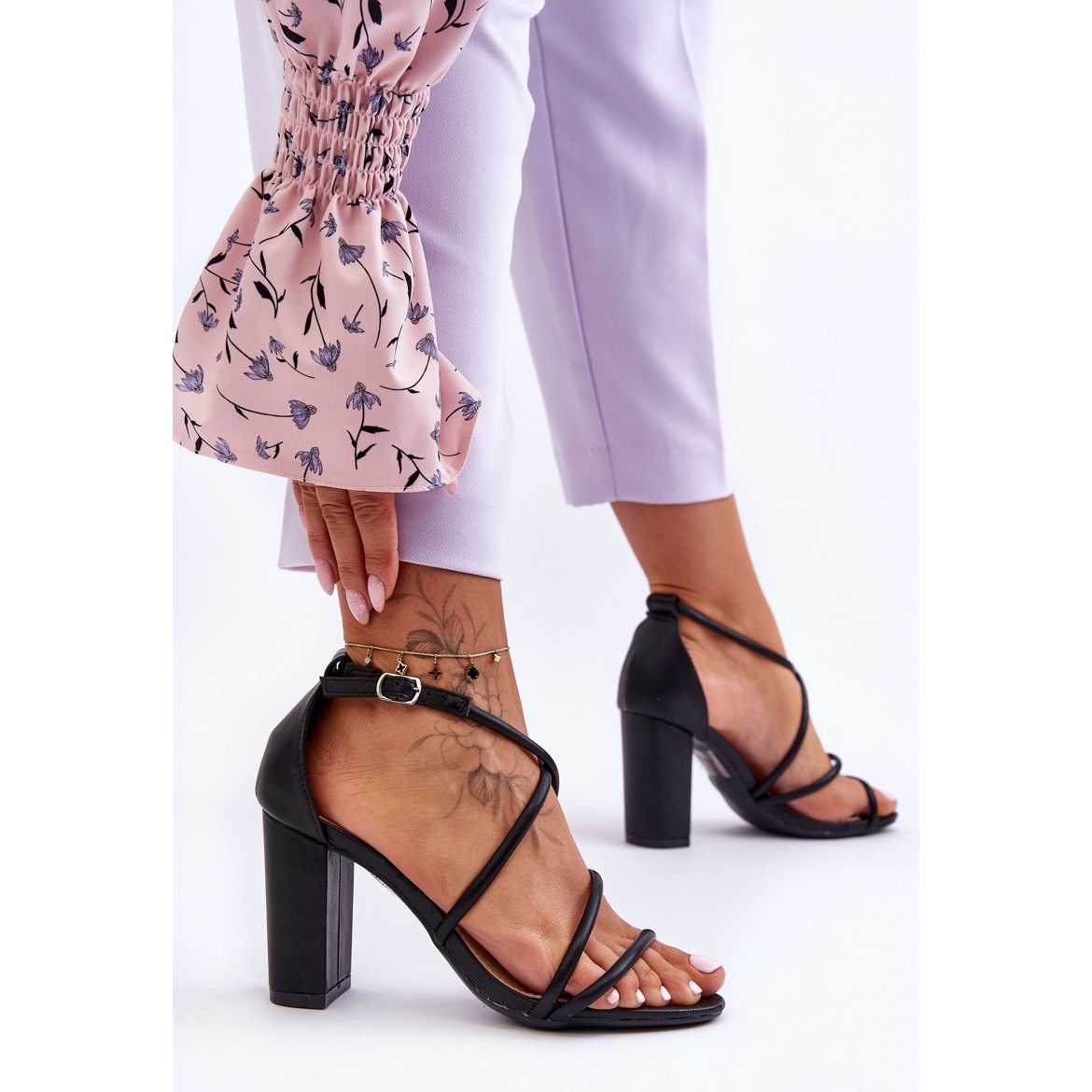 Sandalele sunt așezate pe un toc solid de 9 cm înălțime, care nu numai că adaugă un plus de eleganță, ci și alungește optic picioarele. Acest stil arată grozav pe picior, ceea ce le face o alegere perfectă pentru sărbători, întâlniri și întâlniri de afaceri. O curea reglabilă cu cataramă permite o potrivire perfectă la orice tip de picior.