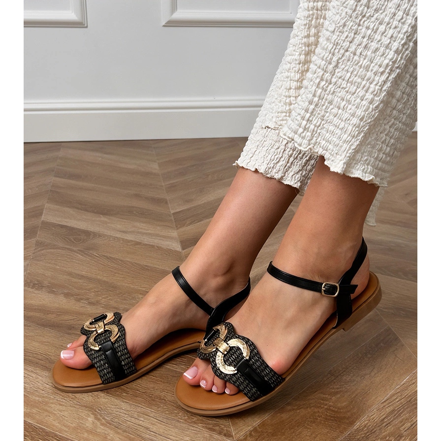 Sandalele plate negre cu un decor auriu sunt un must-have în garderoba de vară a fiecărei femei care dorește să combine stilul cu confortul. Designul lor elegant și minimalist îi face universale și se îmbină perfect atât cu stilizări casual, cât și mai formale.
